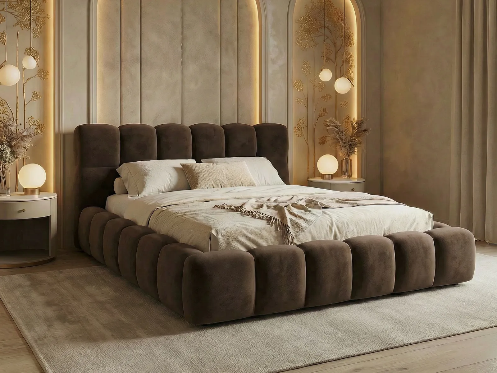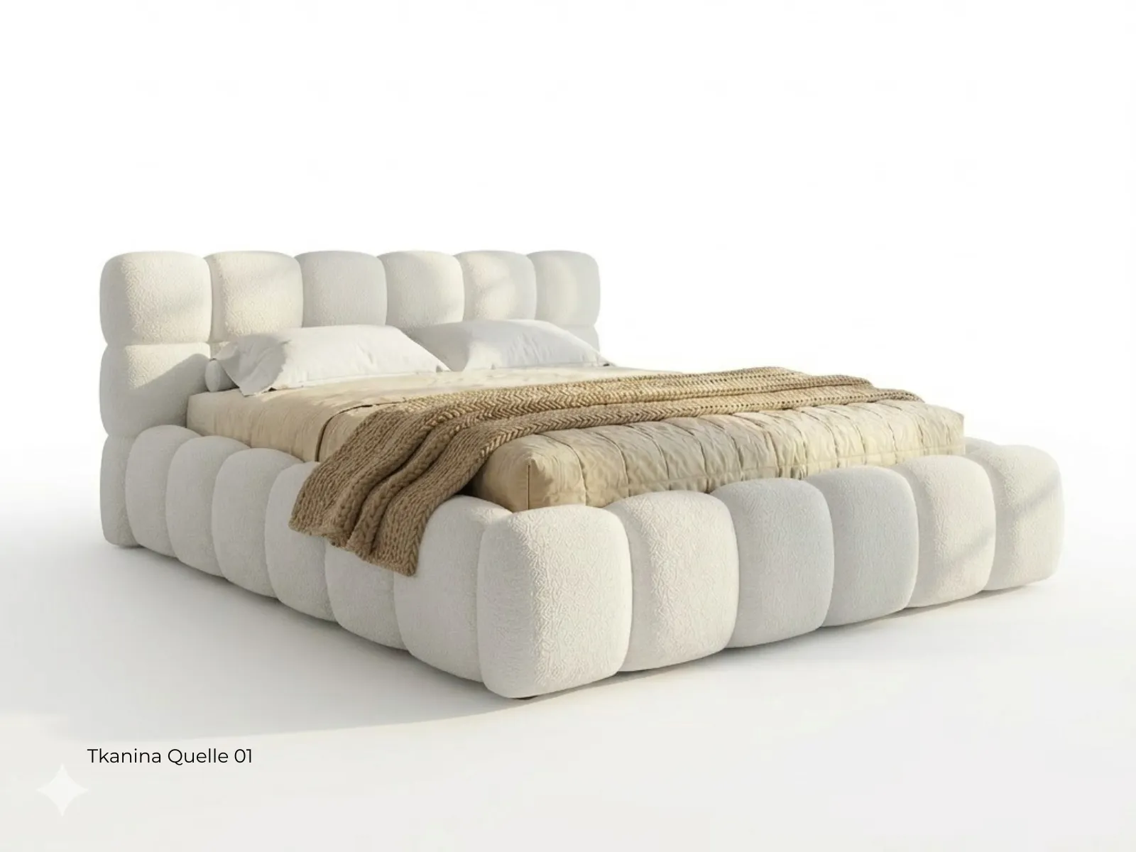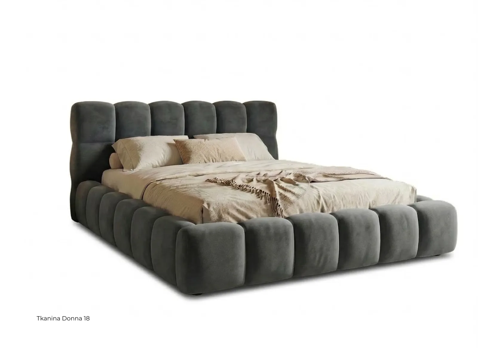 Model wyróżnia się dekoracyjnym pikowaniem, lekką formą oraz tapicerowanym wykończeniem, które nadaje wnętrzu przytulny i nowoczesny charakter. Dodatkowym atutem jest możliwość zmiany tkaniny, dzięki czemu łóżko można lepiej dopasować do stylu wnętrza i własnych preferencji.