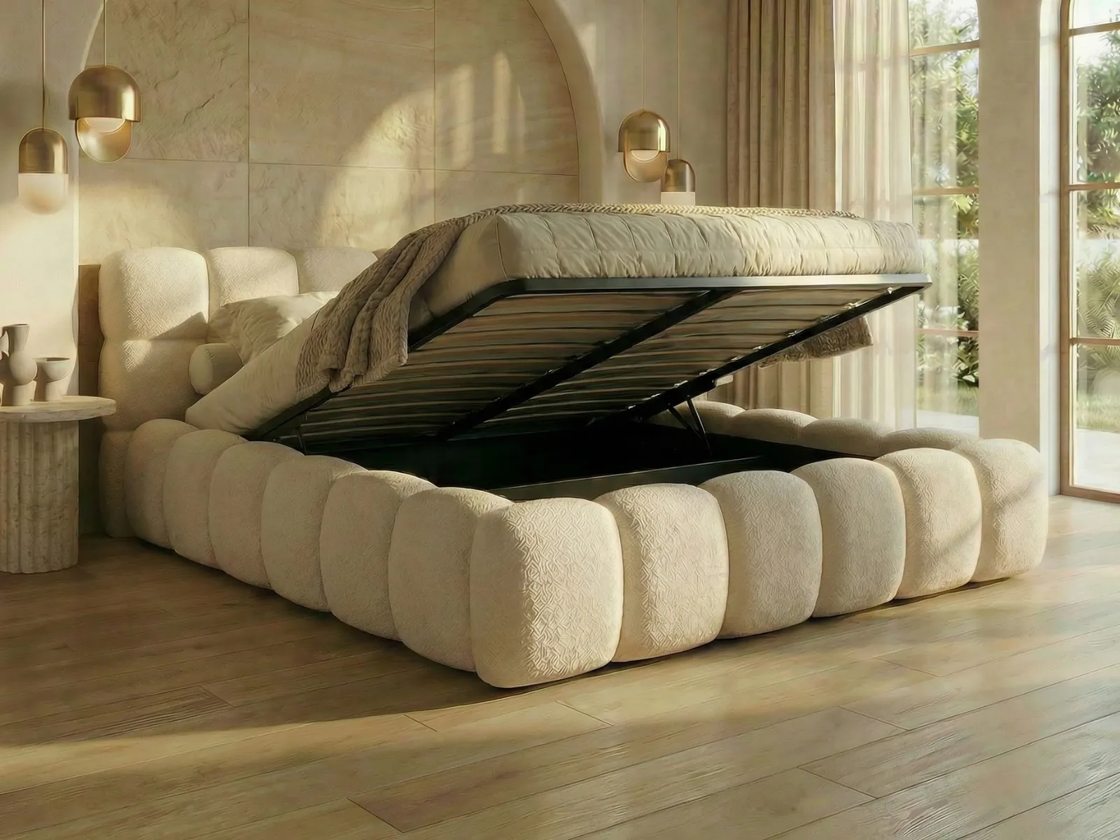 Łóżko tapicerowane Aster Slim 140x200 z pojemnikiem na pościel i stelażem, beżowe boucle