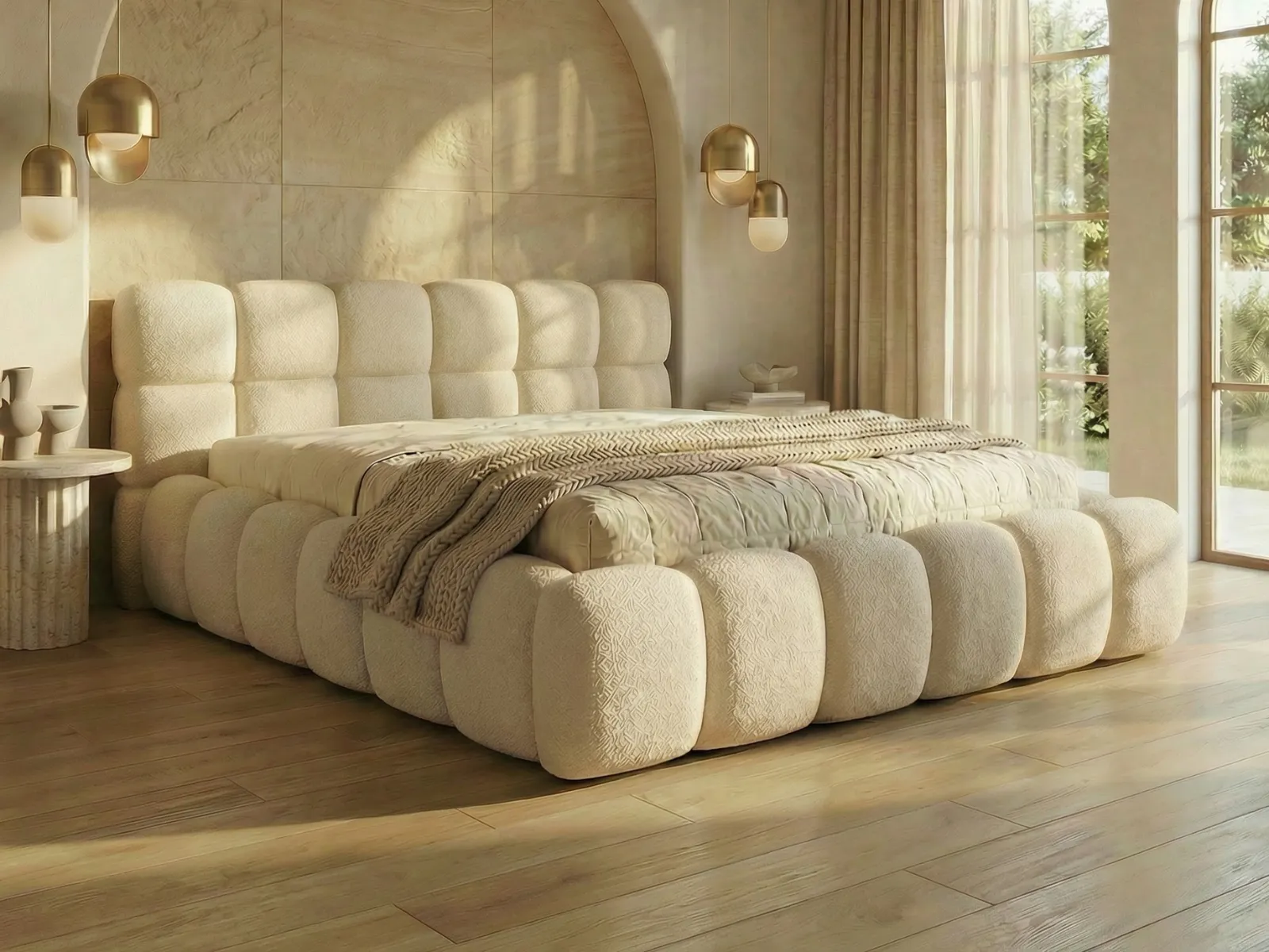 Model Aster Slim wykonany jest w modnej tkaninie boucle, która nadaje łóżku miękki, przytulny i elegancki wygląd. To materiał chętnie wybierany do nowoczesnych i stylowych sypialni. Dodatkowo model posiada możliwość zmiany tkaniny, co pozwala lepiej dopasować łóżko do aranżacji wnętrza.
