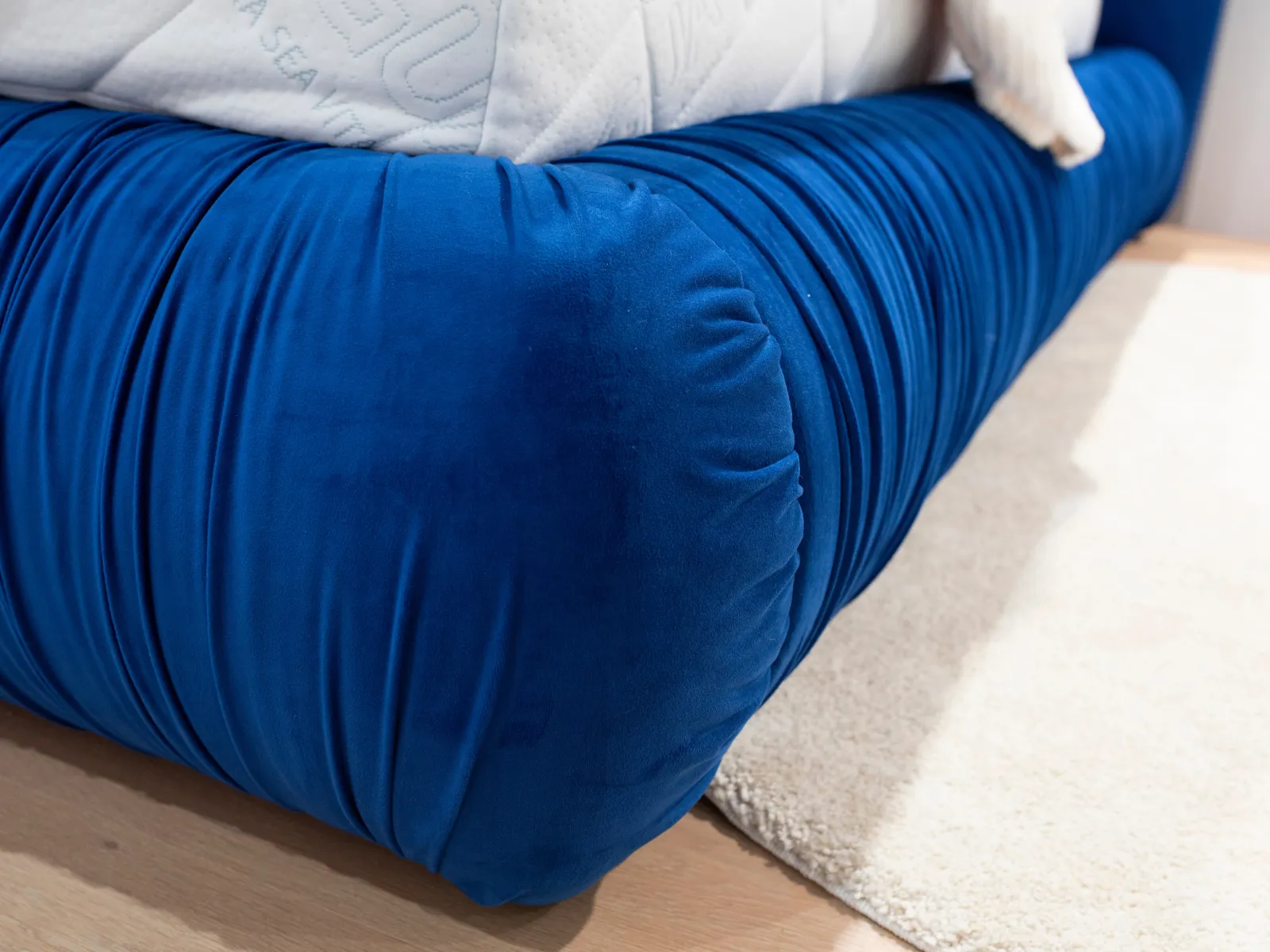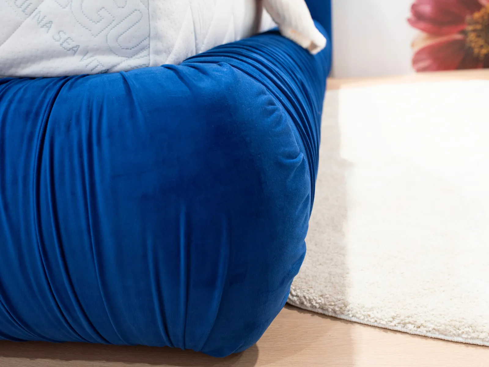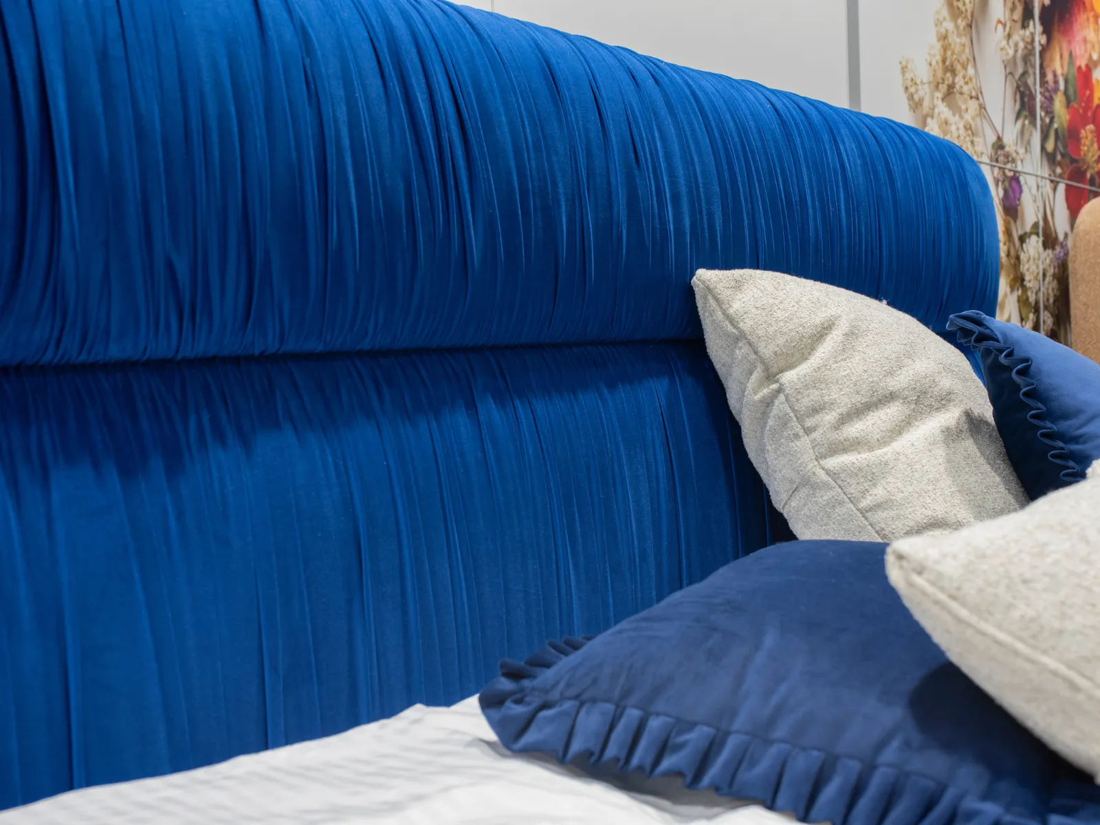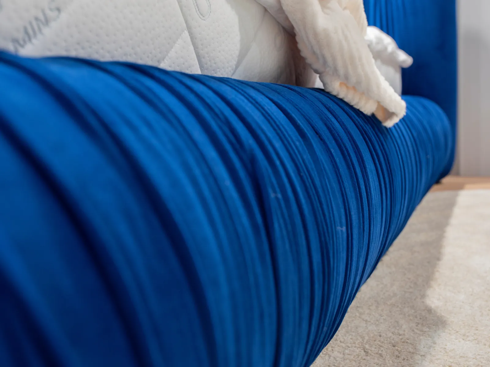 Prezentowany model został obity tkaniną welurową w niebieskim odcieniu, która podkreśla jego wyrazisty charakter i nadaje sypialni stylowy wygląd.