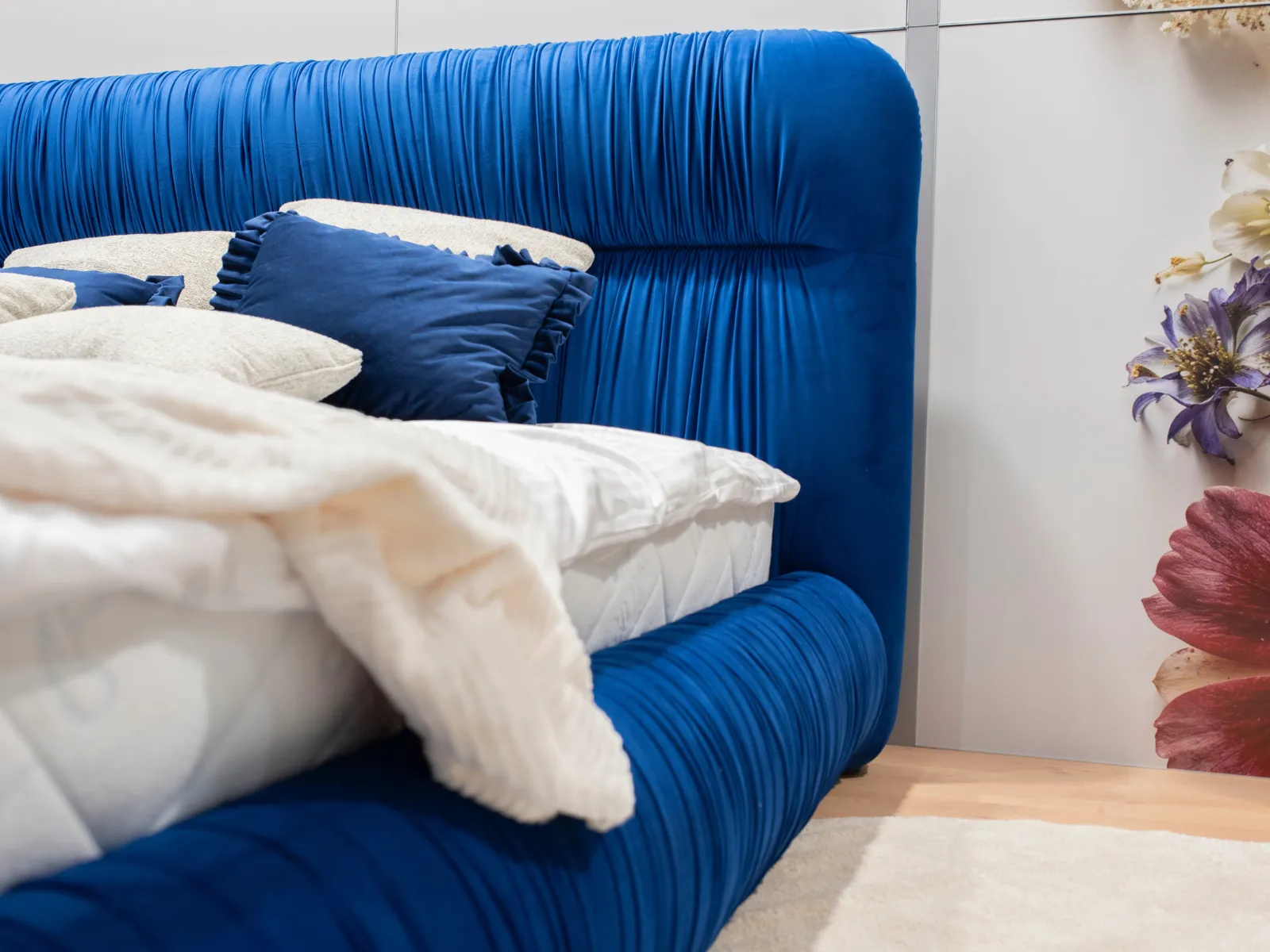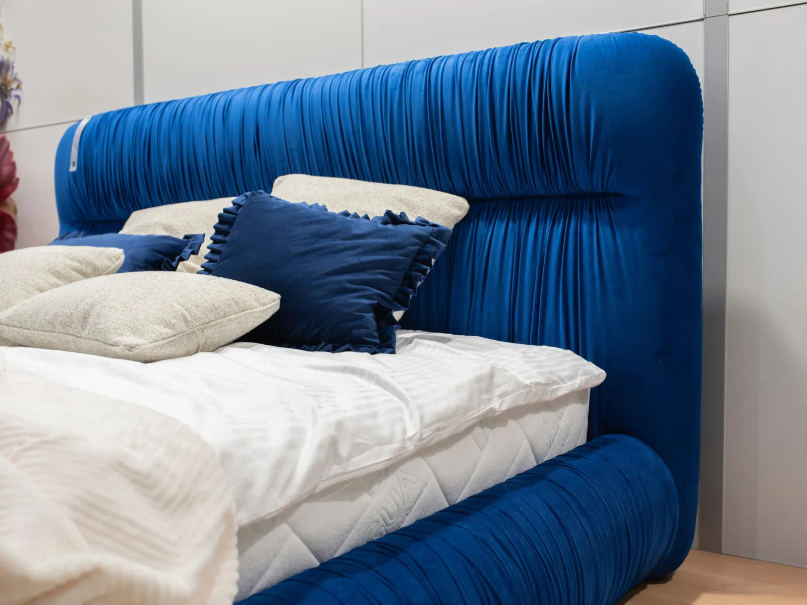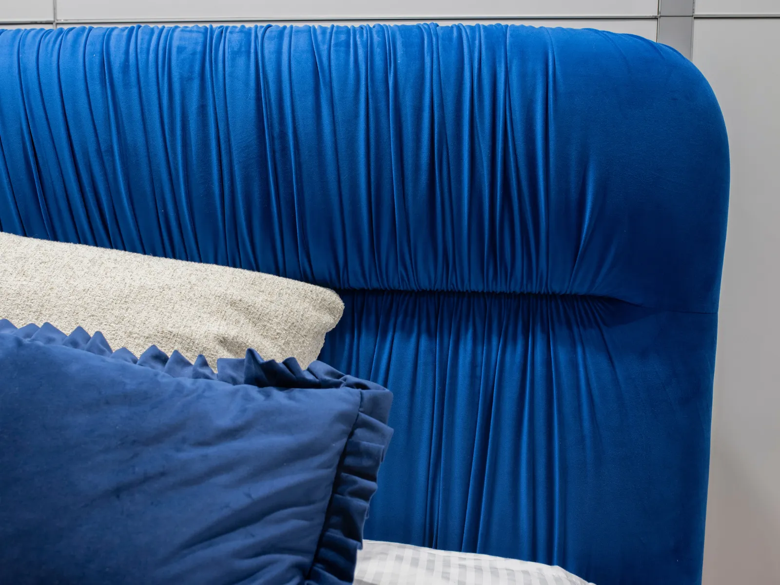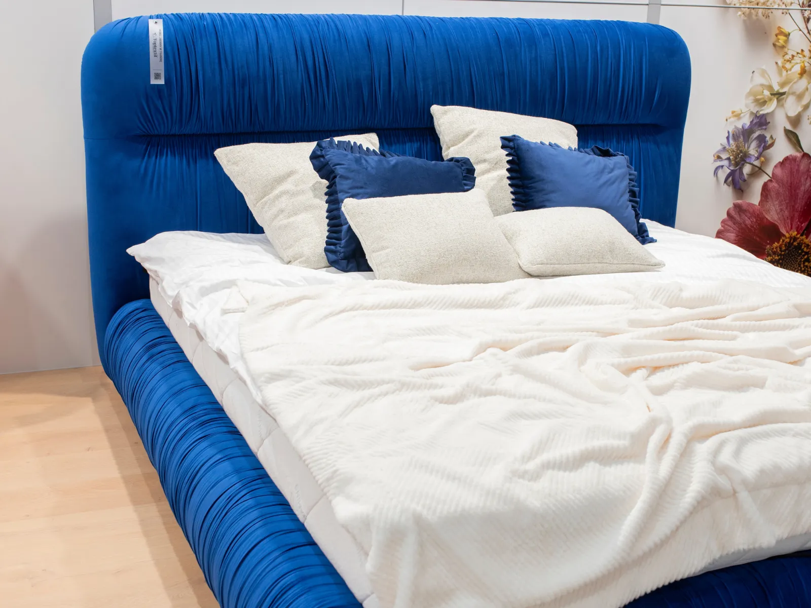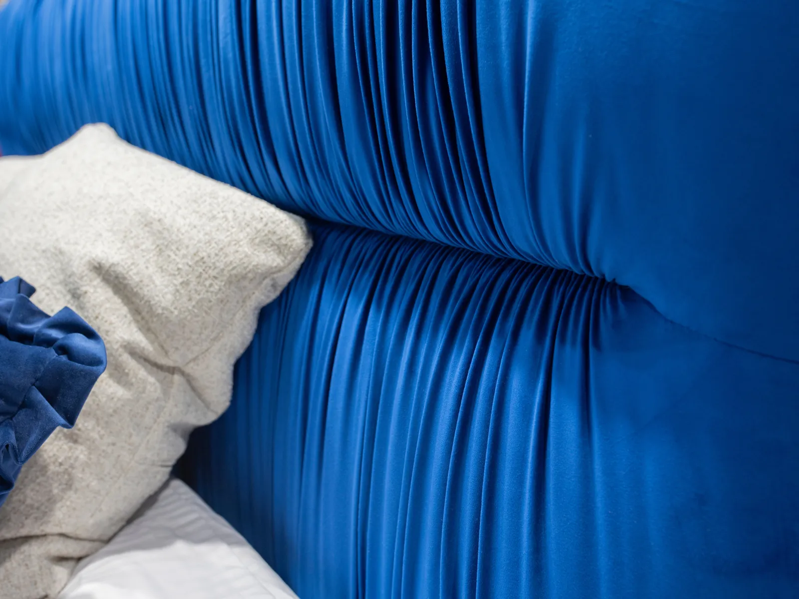 Prezentowany model został obity tkaniną welurową w niebieskim odcieniu, która podkreśla jego wyrazisty charakter i nadaje sypialni stylowy wygląd.