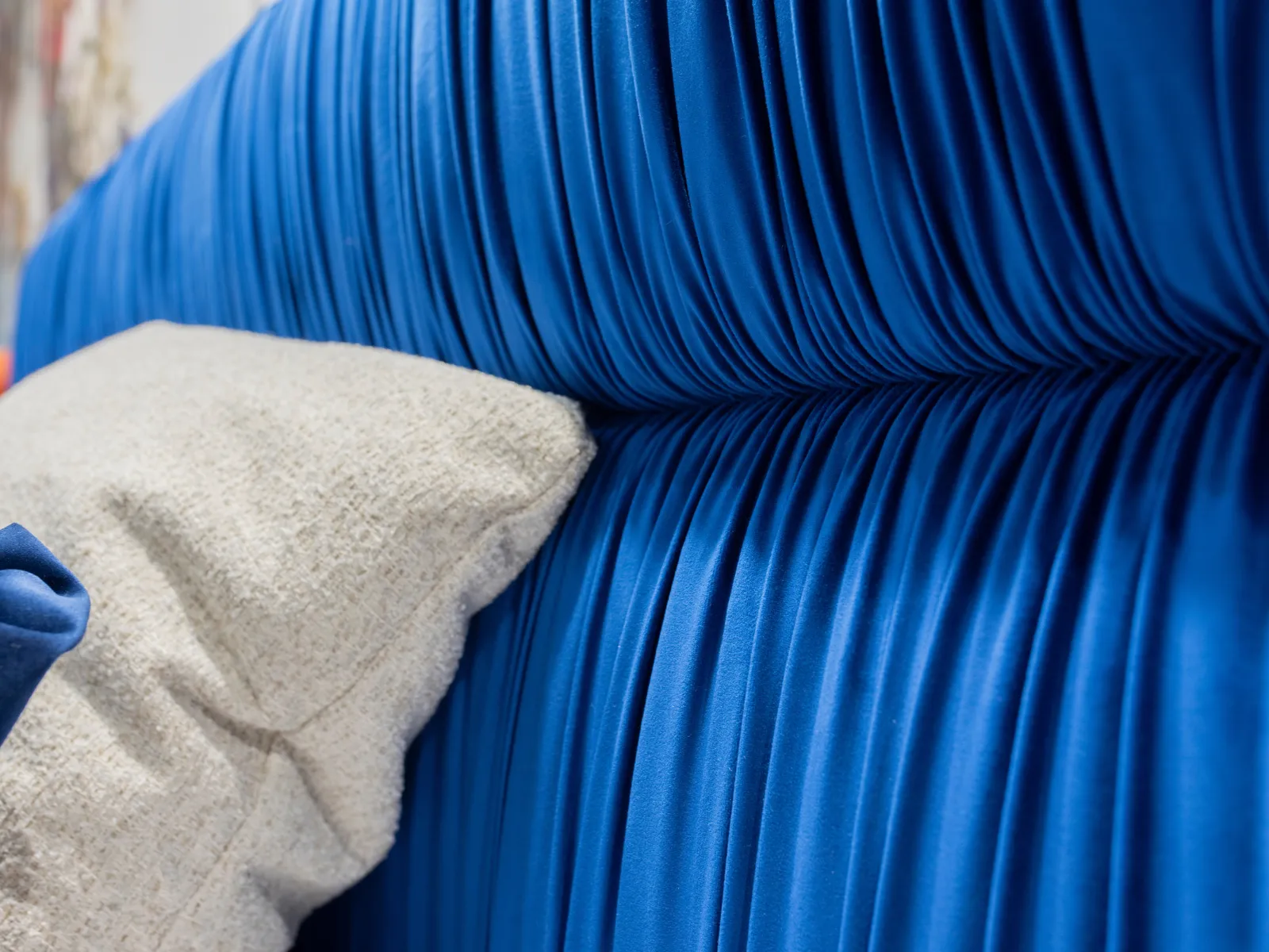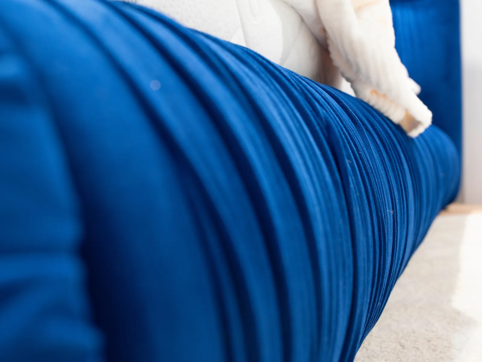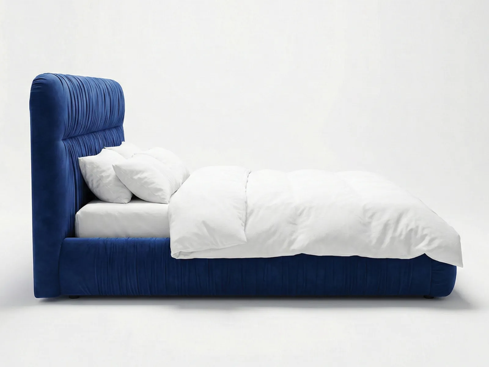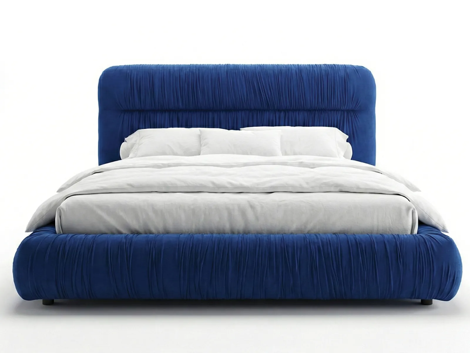 Prezentowany model został obity tkaniną welurową w niebieskim odcieniu, która podkreśla jego wyrazisty charakter i nadaje sypialni stylowy wygląd.