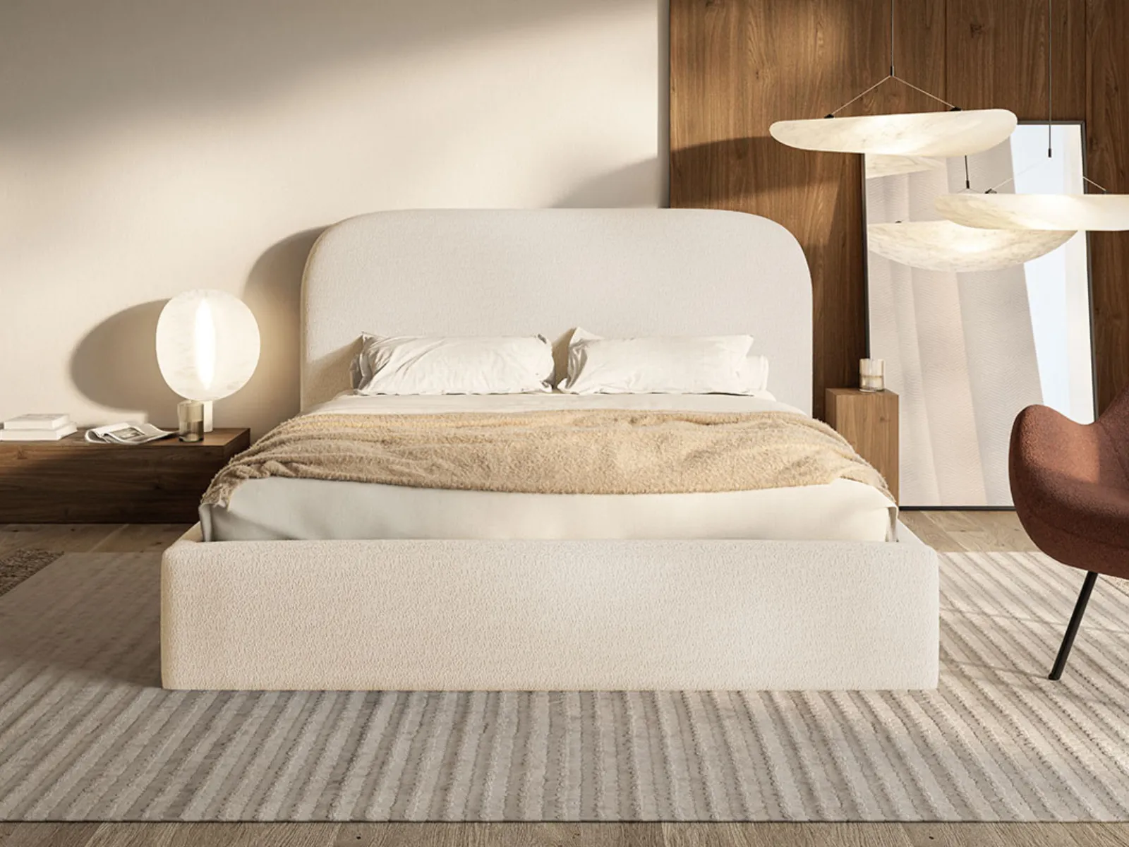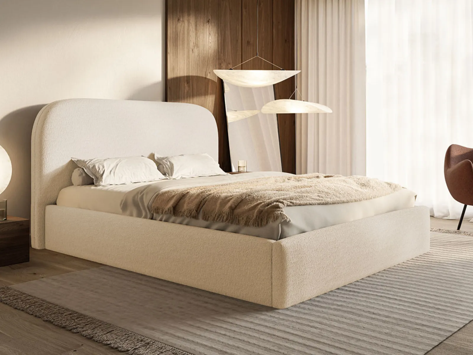 Łóżko tapicerowane Nadia Slim to dobry wybór dla osób, które szukają modelu łączącego estetyczny wygląd z praktycznymi rozwiązaniami. Tapicerka w tkaninie boucle nadaje mu modny, przytulny charakter, dzięki czemu łóżko dobrze prezentuje się w nowoczesnej sypialni i łatwo dopasowuje się do wielu aranżacji.