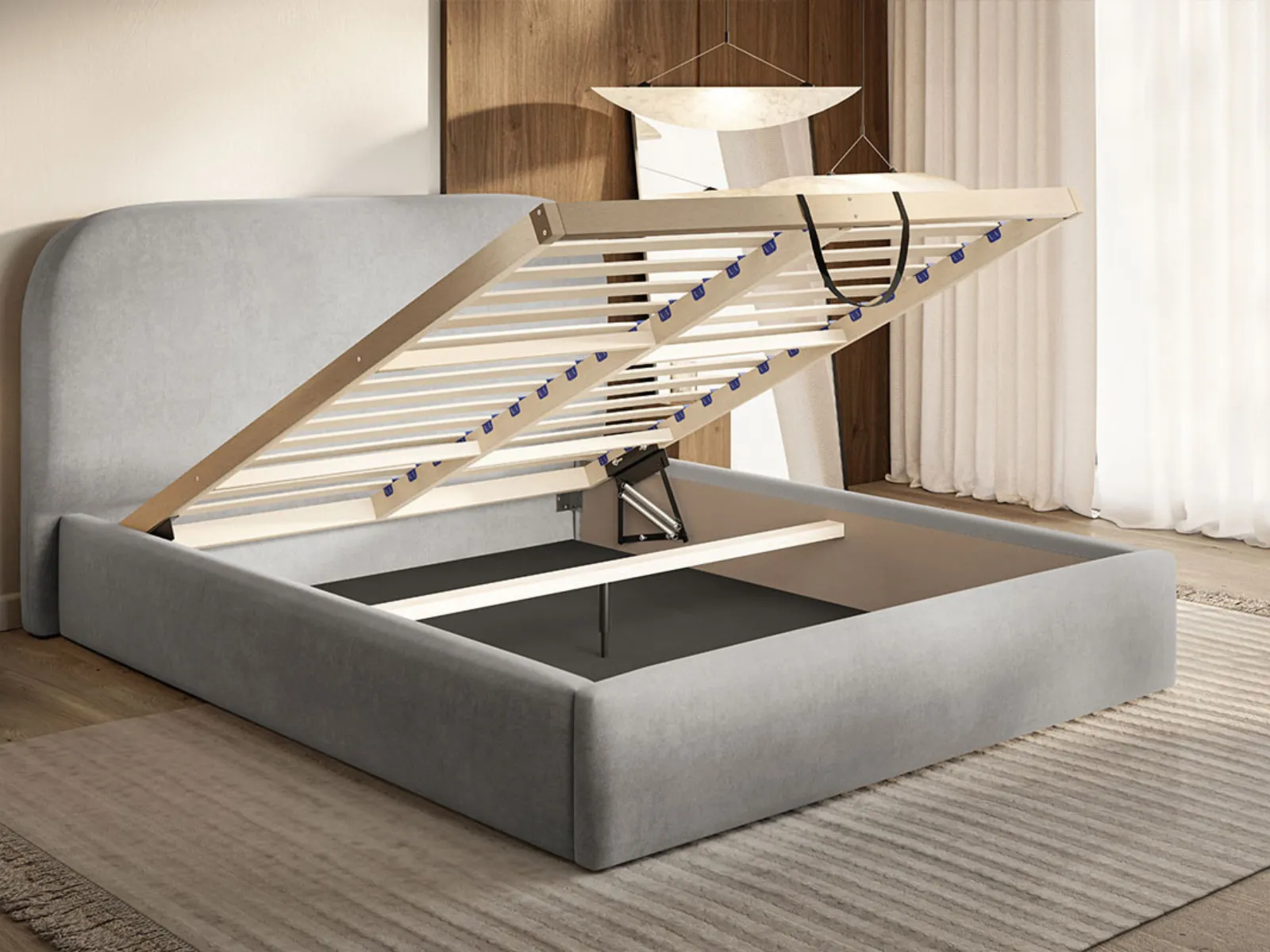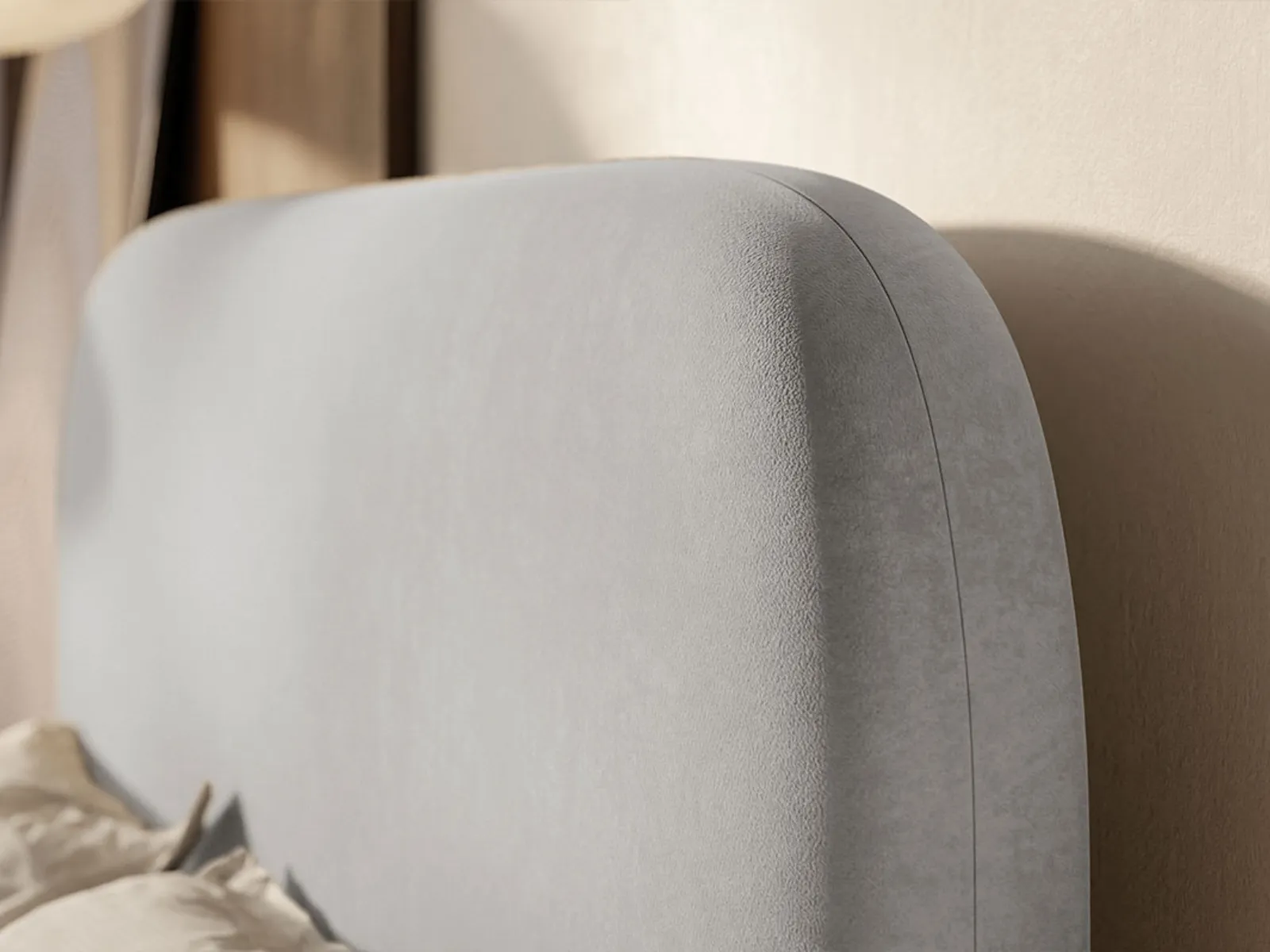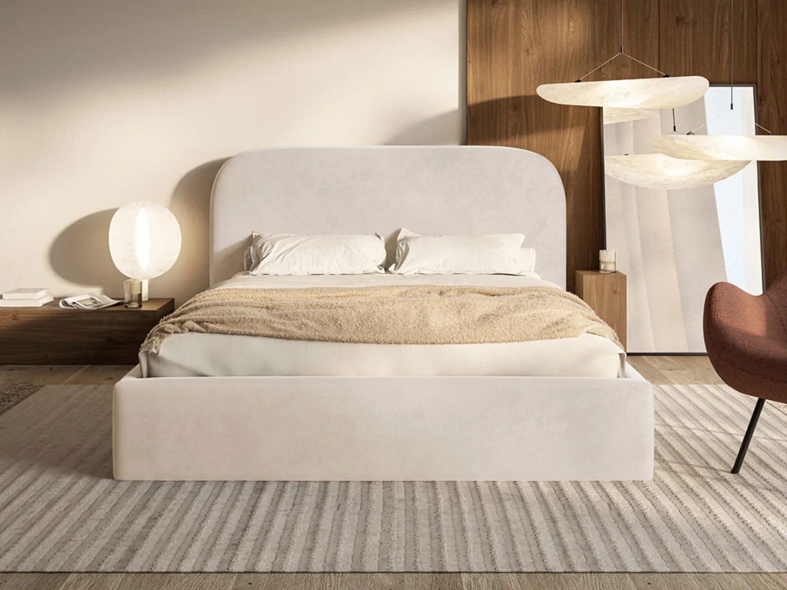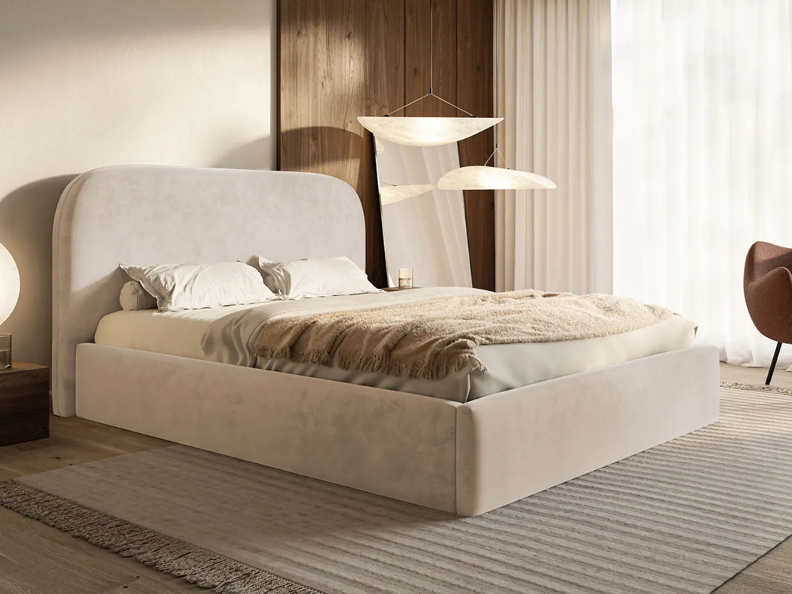 Tapicerka z tkaniny Amor Velvet 4304 w kolorze beżowym sprawia, że łóżko prezentuje się elegancko i przytulnie. Welurowe wykończenie dodaje wnętrzu ciepła, a zaokrąglona forma podkreśla miękki, nowoczesny charakter modelu.