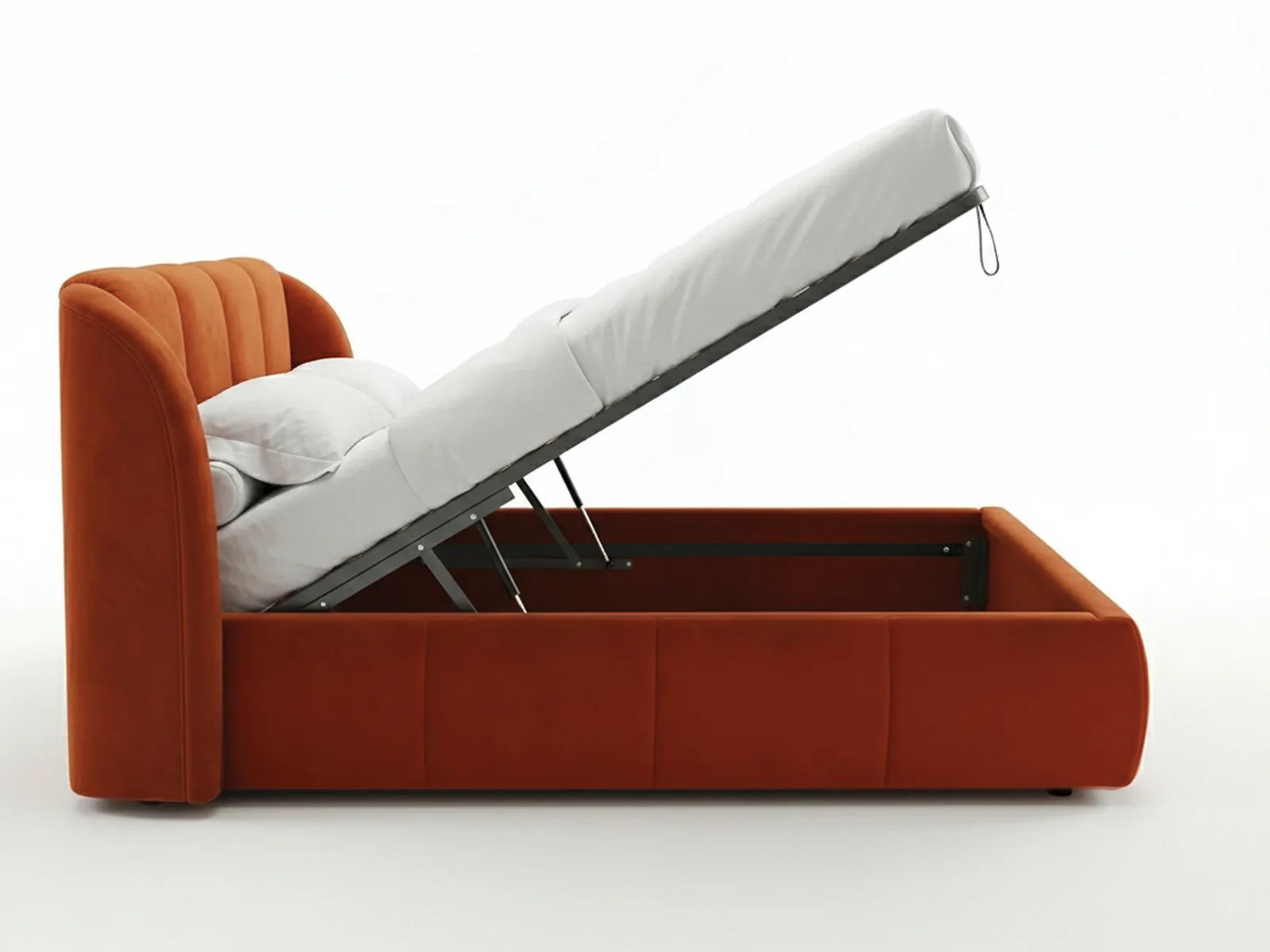 Łóżko tapicerowane Orelia 180x200 cm z pojemnikiem na pościel i metalowym stelażem, pomarańczowy welur
