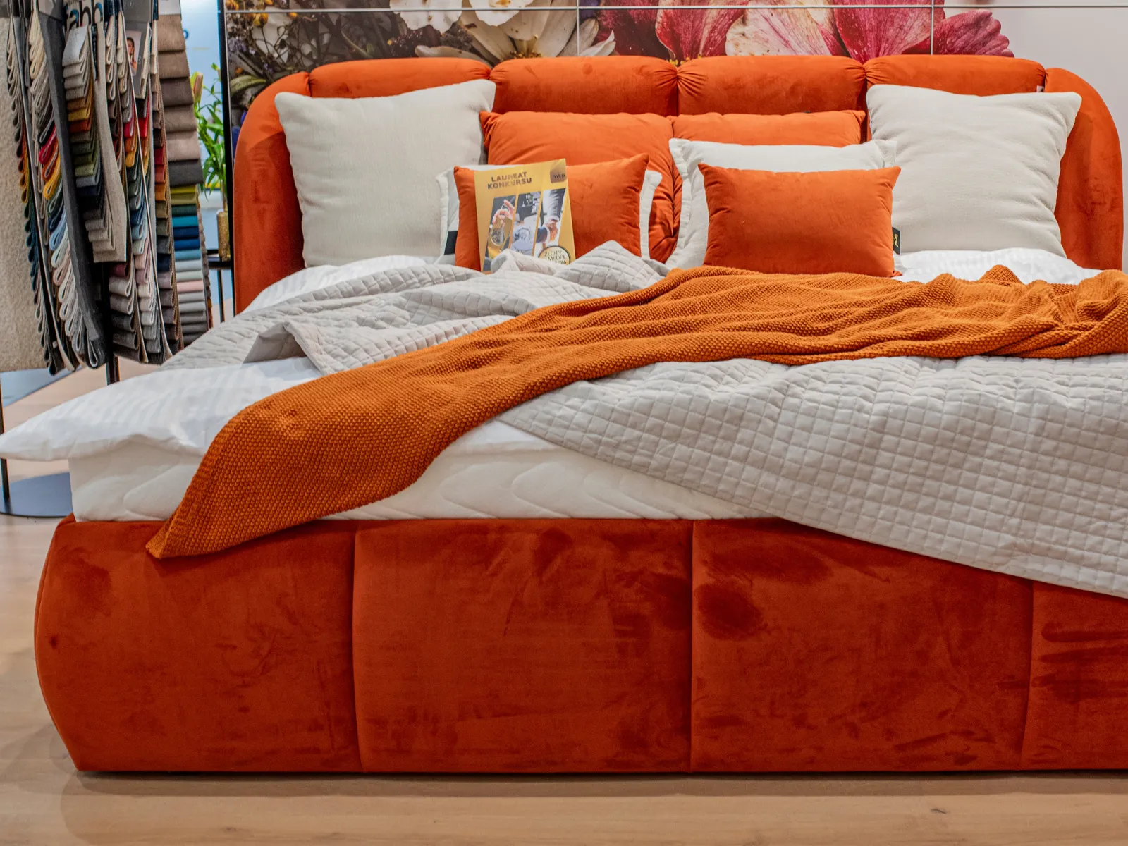 Prezentowany model został obity tkaniną welurową w ciepłym, pomarańczowym odcieniu, który podkreśla jego charakter i nadaje sypialni przytulny, elegancki wygląd.