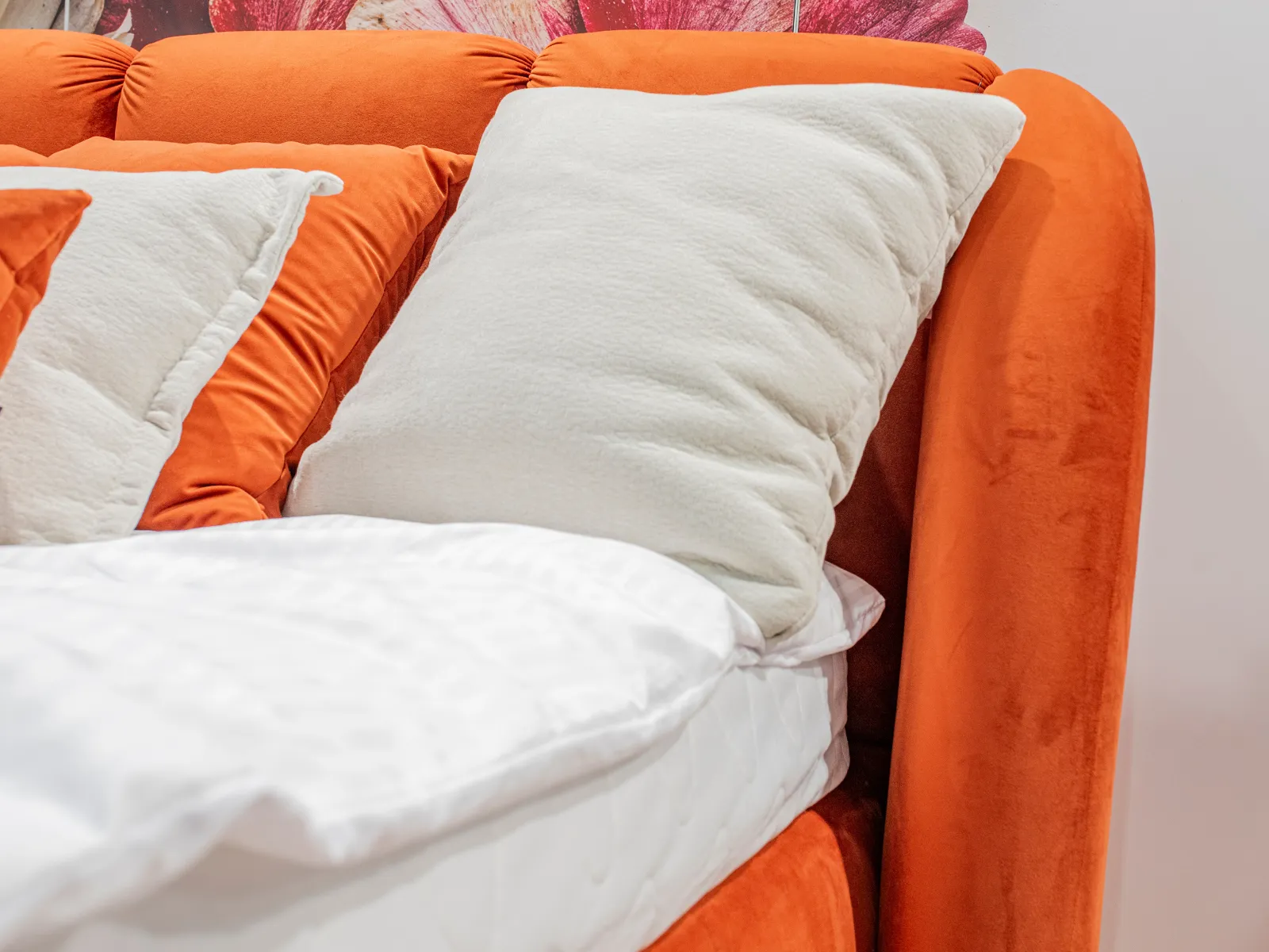 Prezentowany model został obity tkaniną welurową w ciepłym, pomarańczowym odcieniu, który podkreśla jego charakter i nadaje sypialni przytulny, elegancki wygląd.