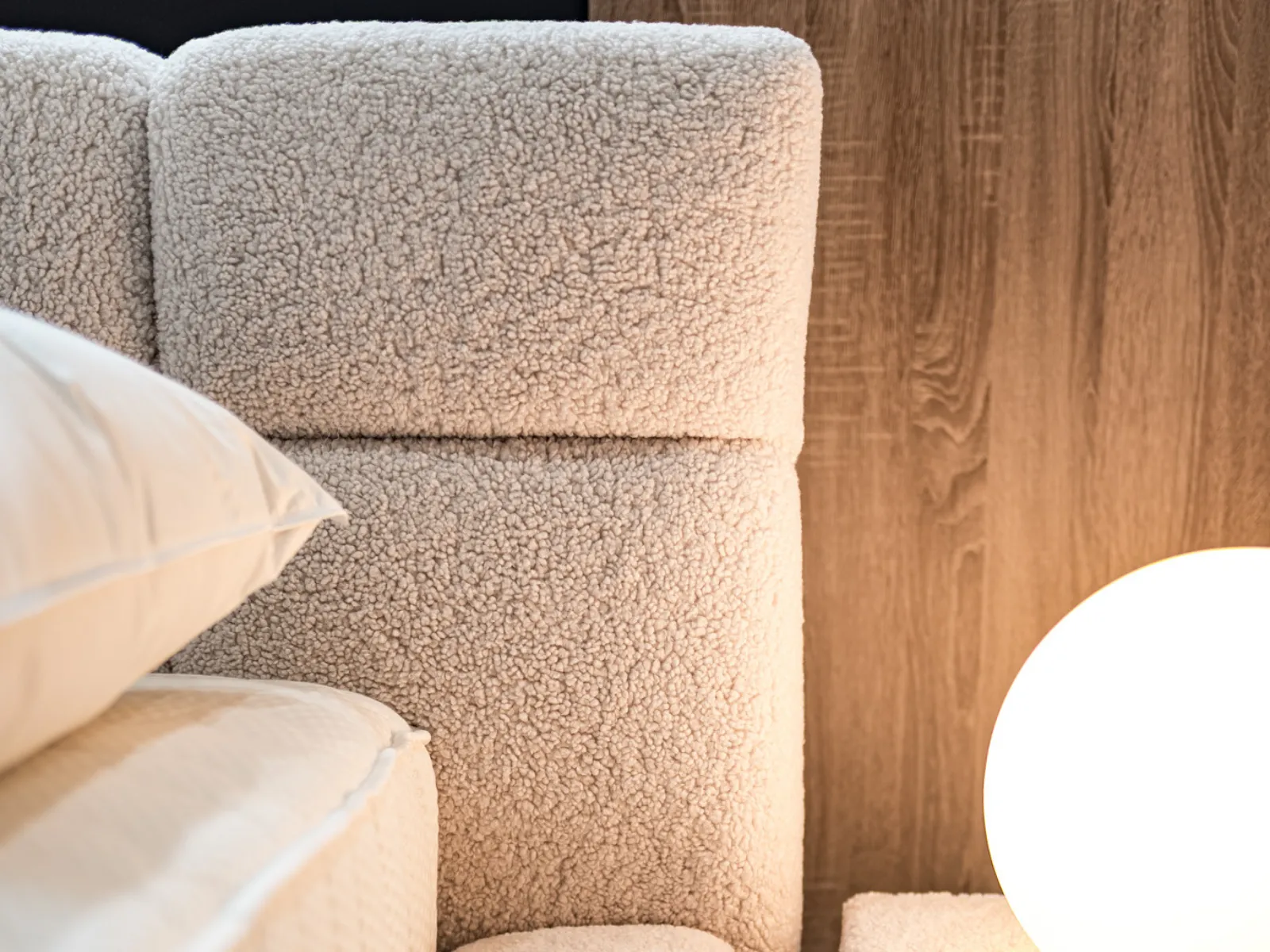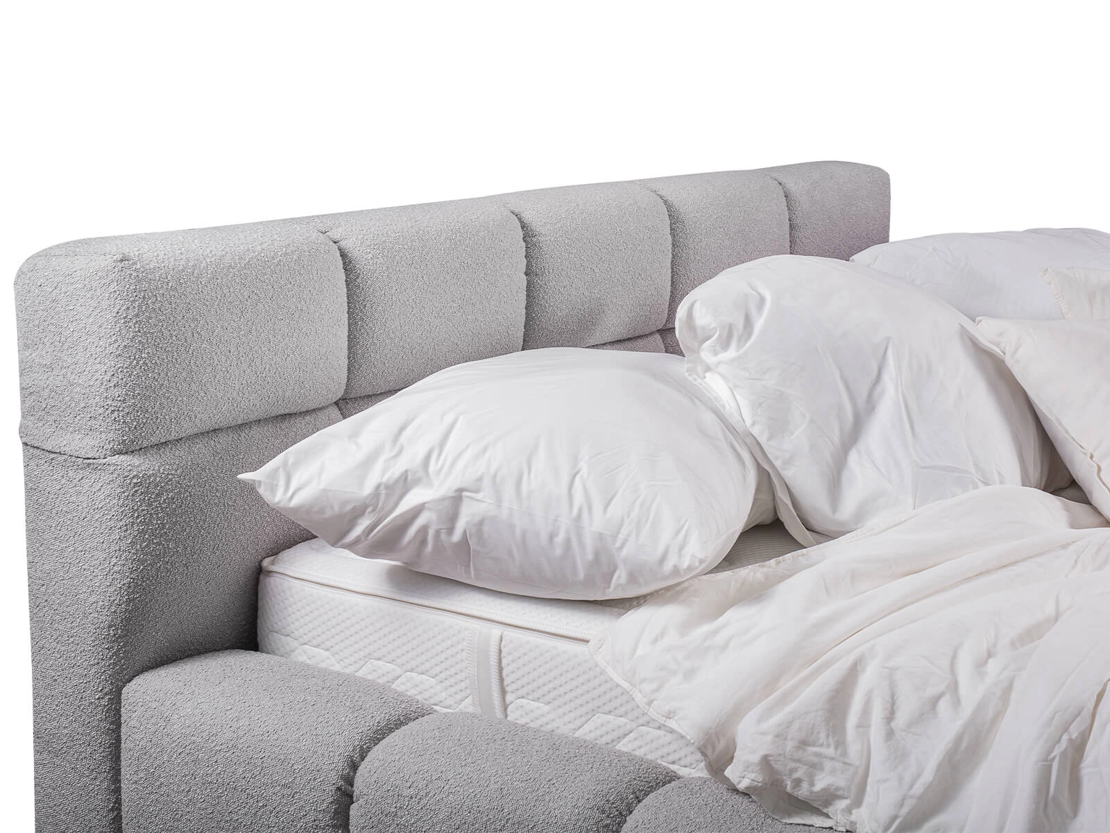 Miękka i wytrzymała tapicerka wykonana z tkaniny boucle w eleganckim szarym kolorze podkreśla nowoczesny charakter łóżka Lilac. Starannie wykonane detale oraz dopracowane proporcje sprawiają, że łóżko prezentuje się stylowo, elegancko i luksusowo.