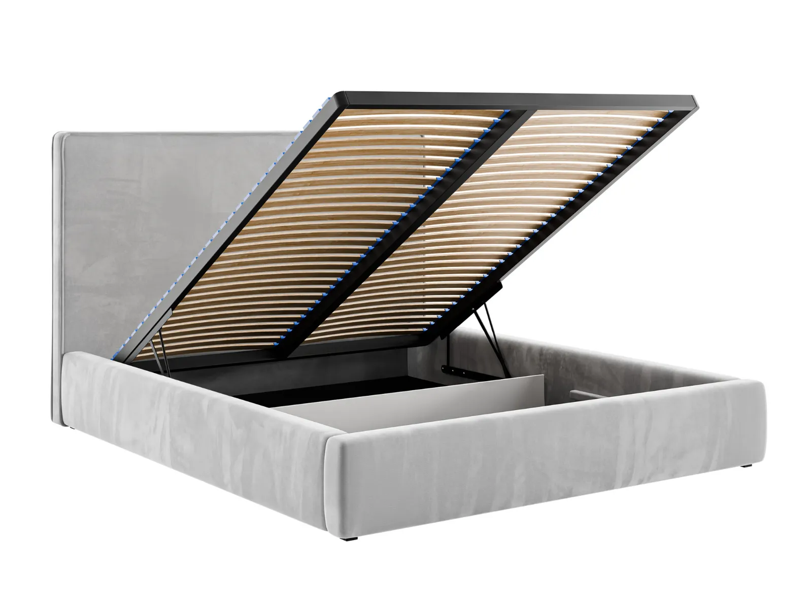 Łóżko tapicerowane LIORO 140x200 cm posiada metalowy stelaż z podnośnikami gazowymi, który zapewnia stabilne podparcie materaca oraz lekkie i płynne otwieranie pojemnika. Zastosowane siłowniki gazowe sprawiają, że unoszenie stelaża jest ciche, bezpieczne i nie wymaga użycia dużej siły.