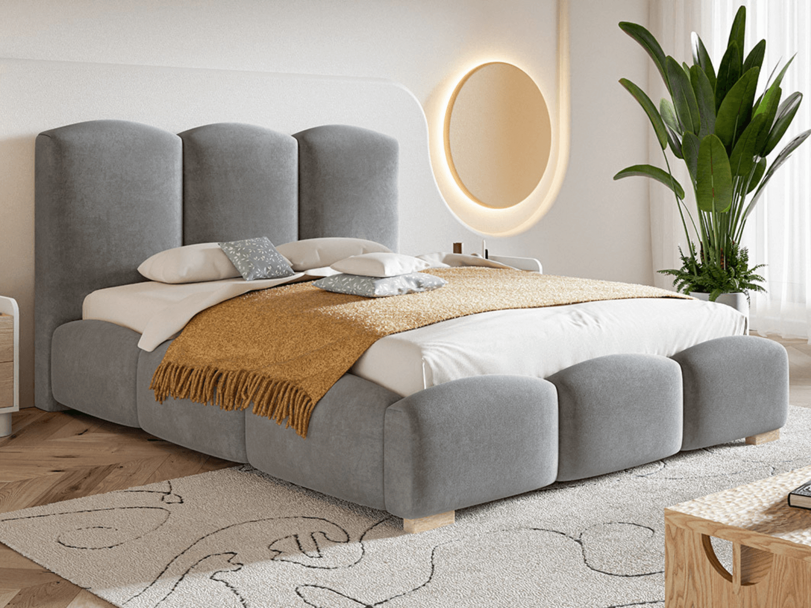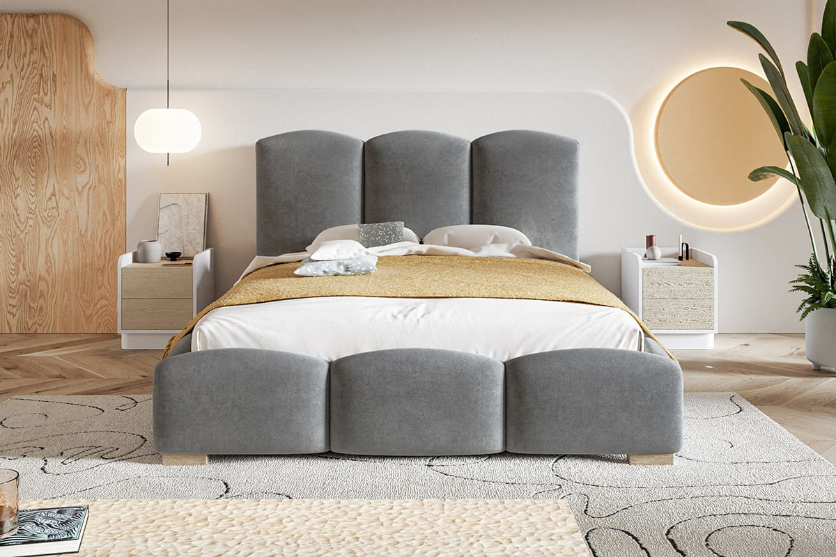 Miękka i trwała tapicerka sprawia, że łóżko tapicerowane Nela jest nie tylko estetyczne, ale również wyjątkowo komfortowe w codziennym użytkowaniu. Starannie wykonane detale podkreślają nowoczesny charakter mebla, a tapicerowane wezgłowie zapewnia wygodne podparcie podczas czytania książki lub oglądania telewizji. Solidna konstrukcja oraz wytrzymały stelaż gwarantują stabilność i długą żywotność, czyniąc model Nela idealnym wyborem jako wygodne łóżko do spania na co dzień.