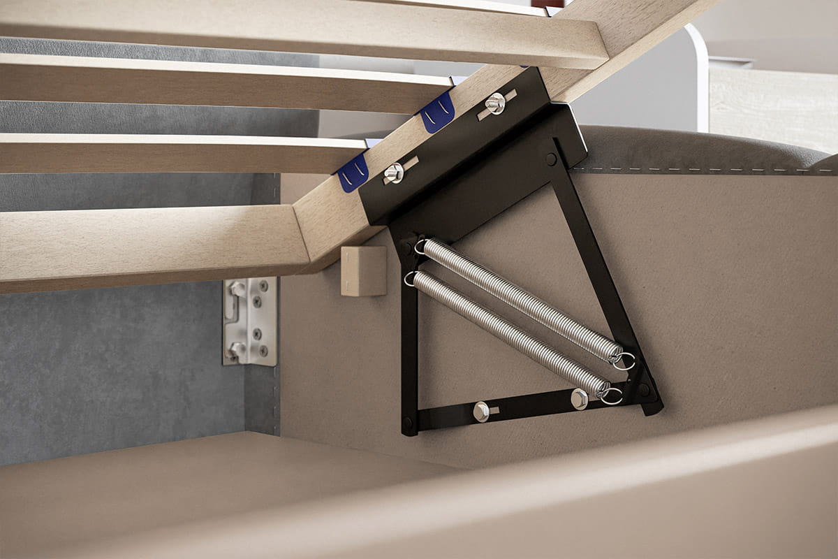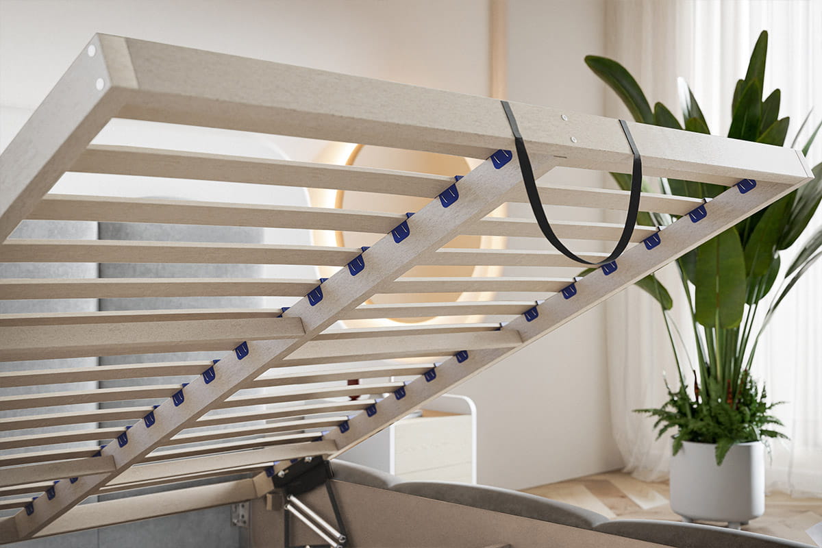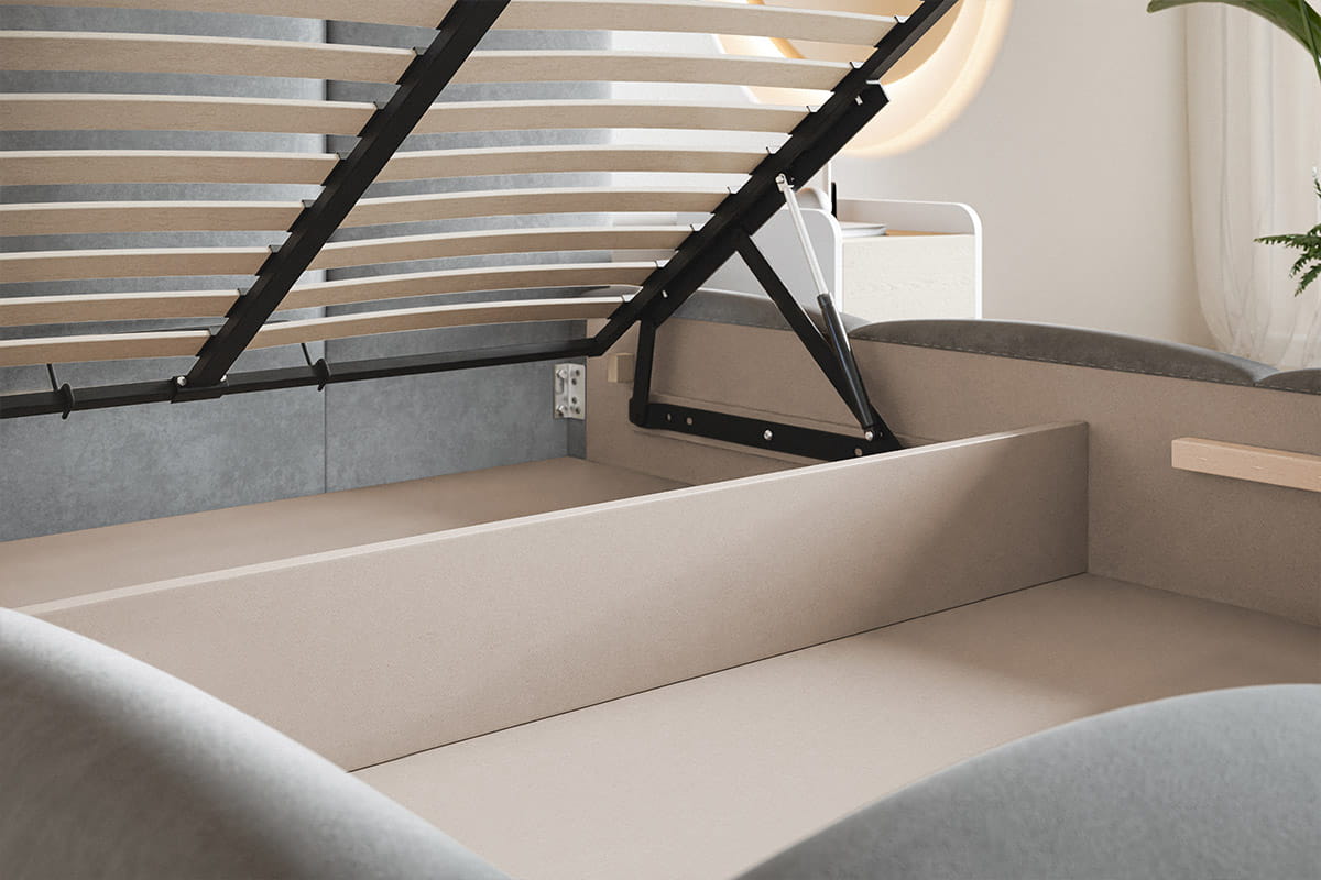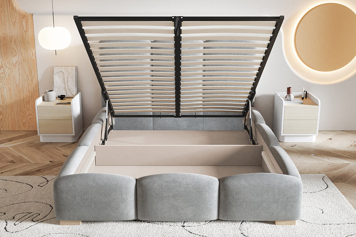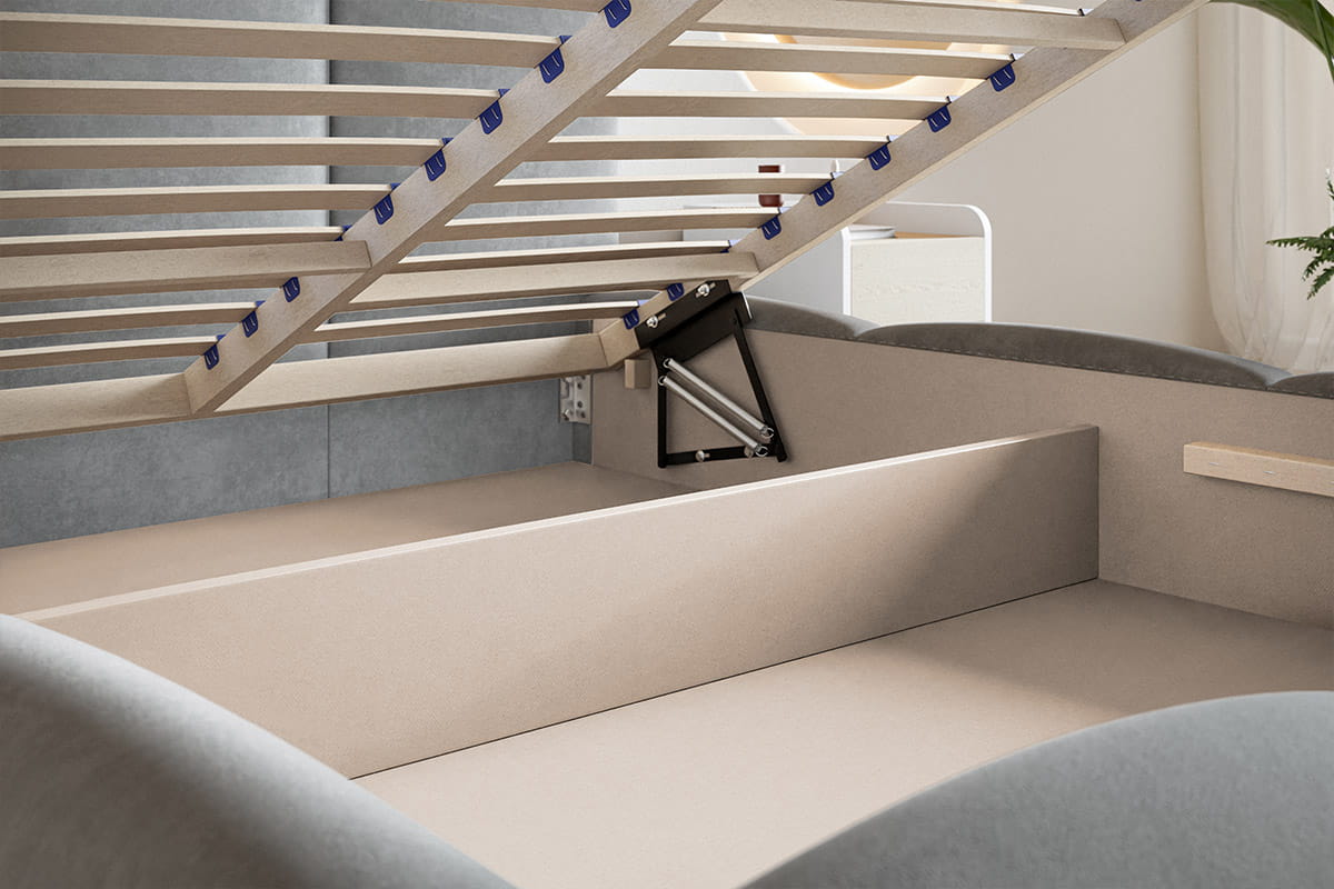 Wyposażone w duży pojemnik na pościel, łóżko Nela umożliwia wygodne przechowywanie kołder, poduszek oraz innych tekstyliów. To praktyczne rozwiązanie dla osób poszukujących łóżka do sypialni z dodatkowym miejscem do przechowywania, które pomaga utrzymać porządek i maksymalnie wykorzystać przestrzeń.
