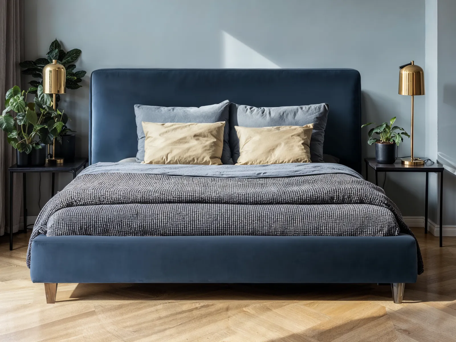 Łóżko tapicerowane 160x200 NOEMA ze stelażem na drewnianych nogach granatowy welur