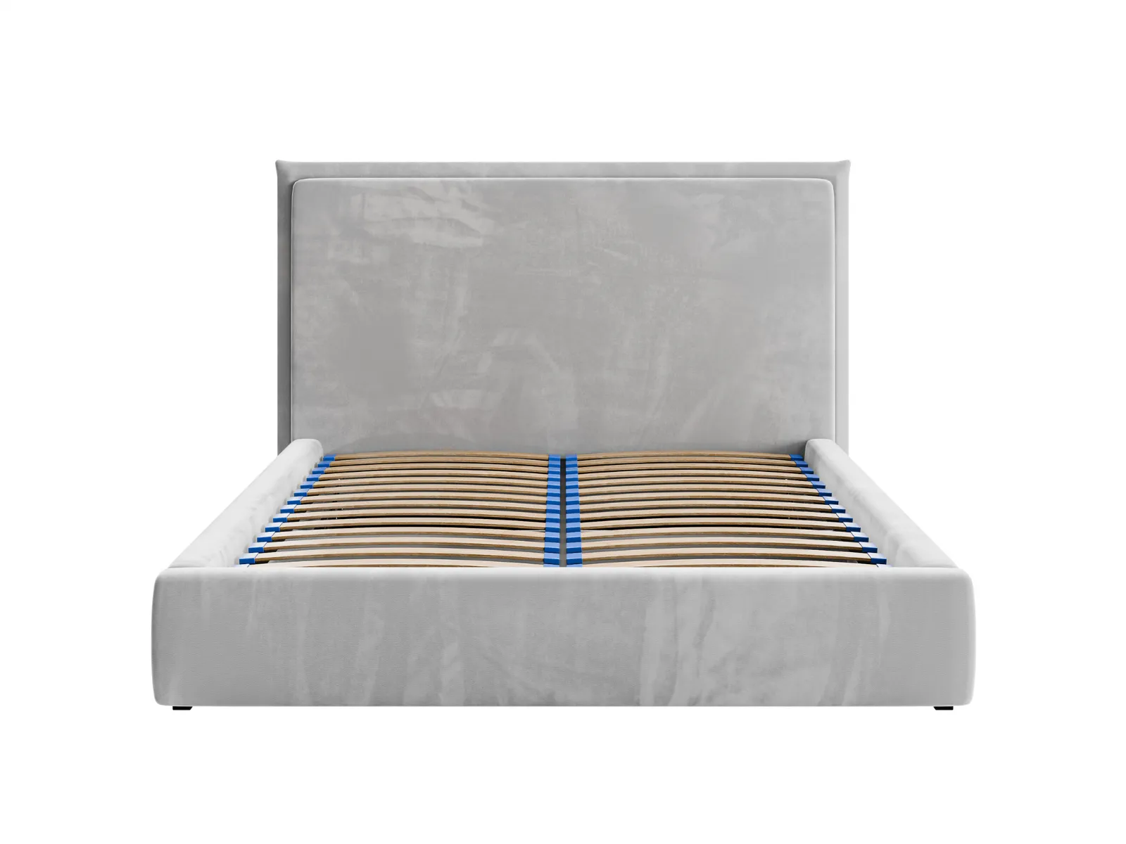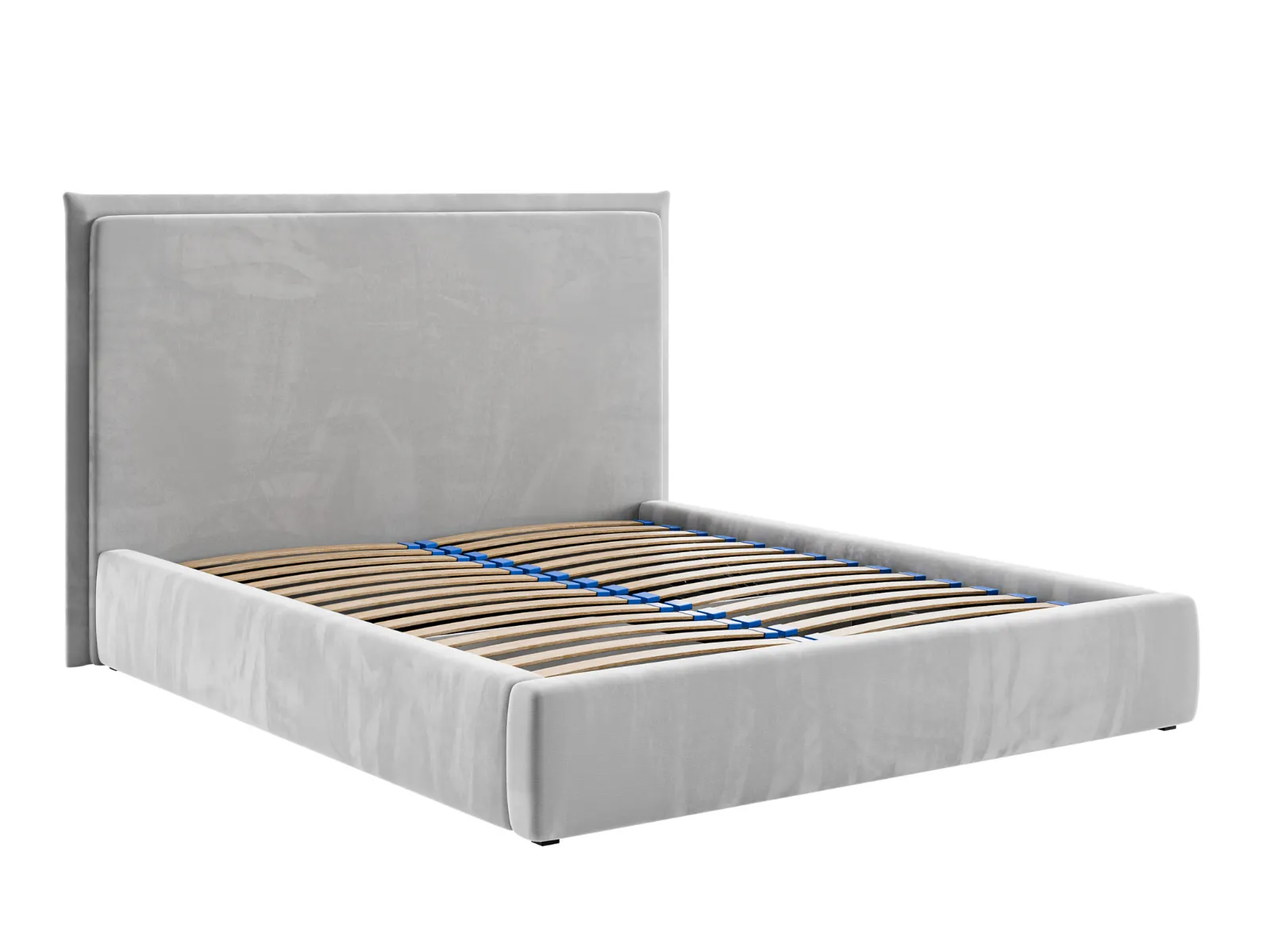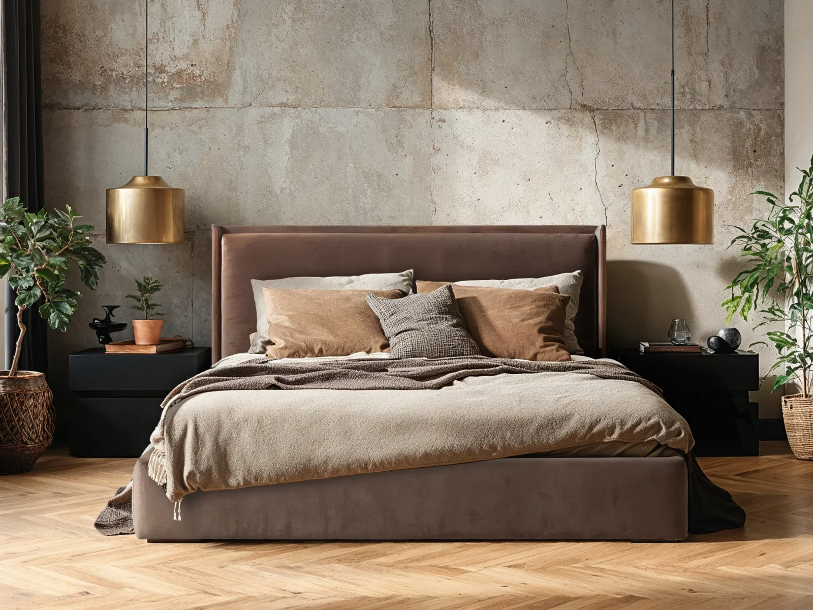 Dzięki swojej bryle łóżko tapicerowane 160x200 cm do sypialni doskonale komponuje się z naturalnym drewnem, betonem architektonicznym oraz stonowaną kolorystyką wnętrz.
