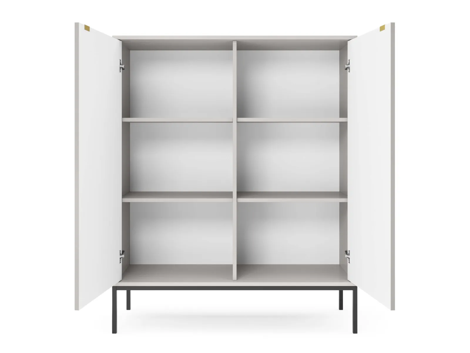 Dzięki przemyślanemu układowi – dwóm pojemnym szafkom z półkami – komoda Bari oferuje mnóstwo miejsca do przechowywania. Bez trudu uporządkujesz ubrania, dokumenty lub inne domowe akcesoria, dbając o porządek i estetykę swojego salonu, sypialni czy przedpokoju. Elegancką, lekką formę podkreśla czarny metalowy stelaż, który nie tylko nadaje meblowi nowoczesny charakter, ale także umożliwia wygodne sprzątanie przestrzeni pod komodą.