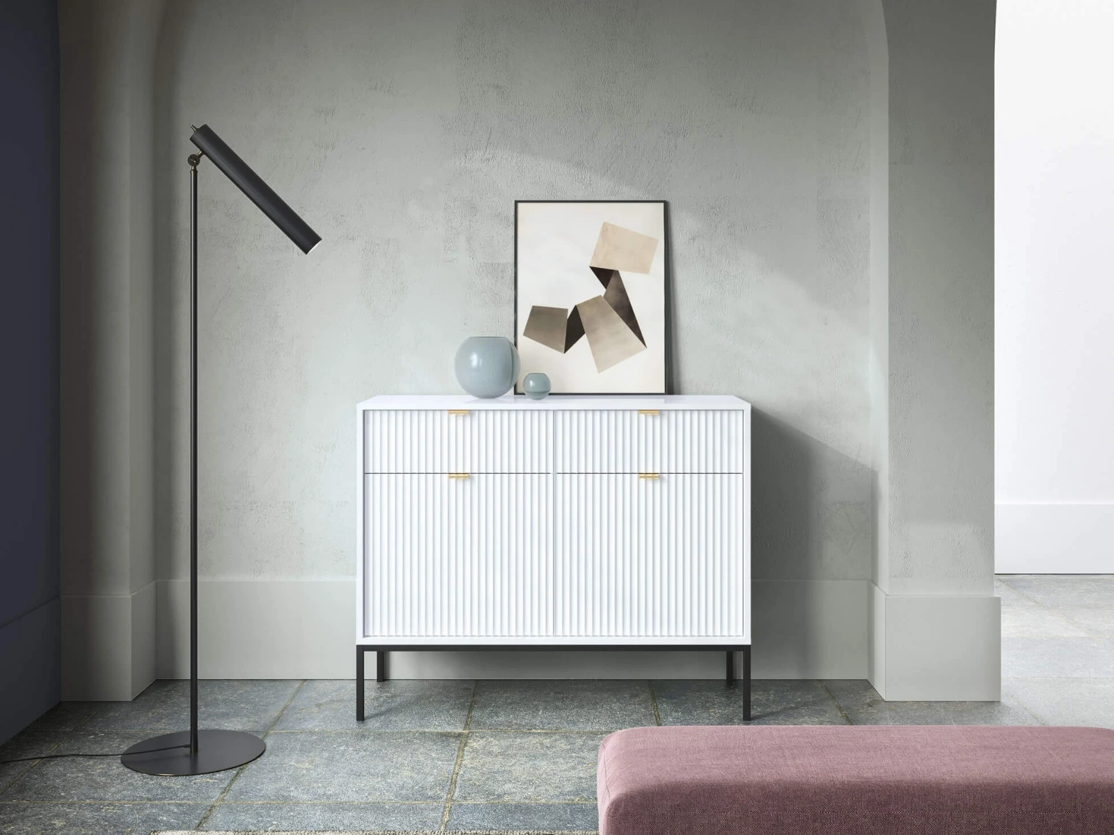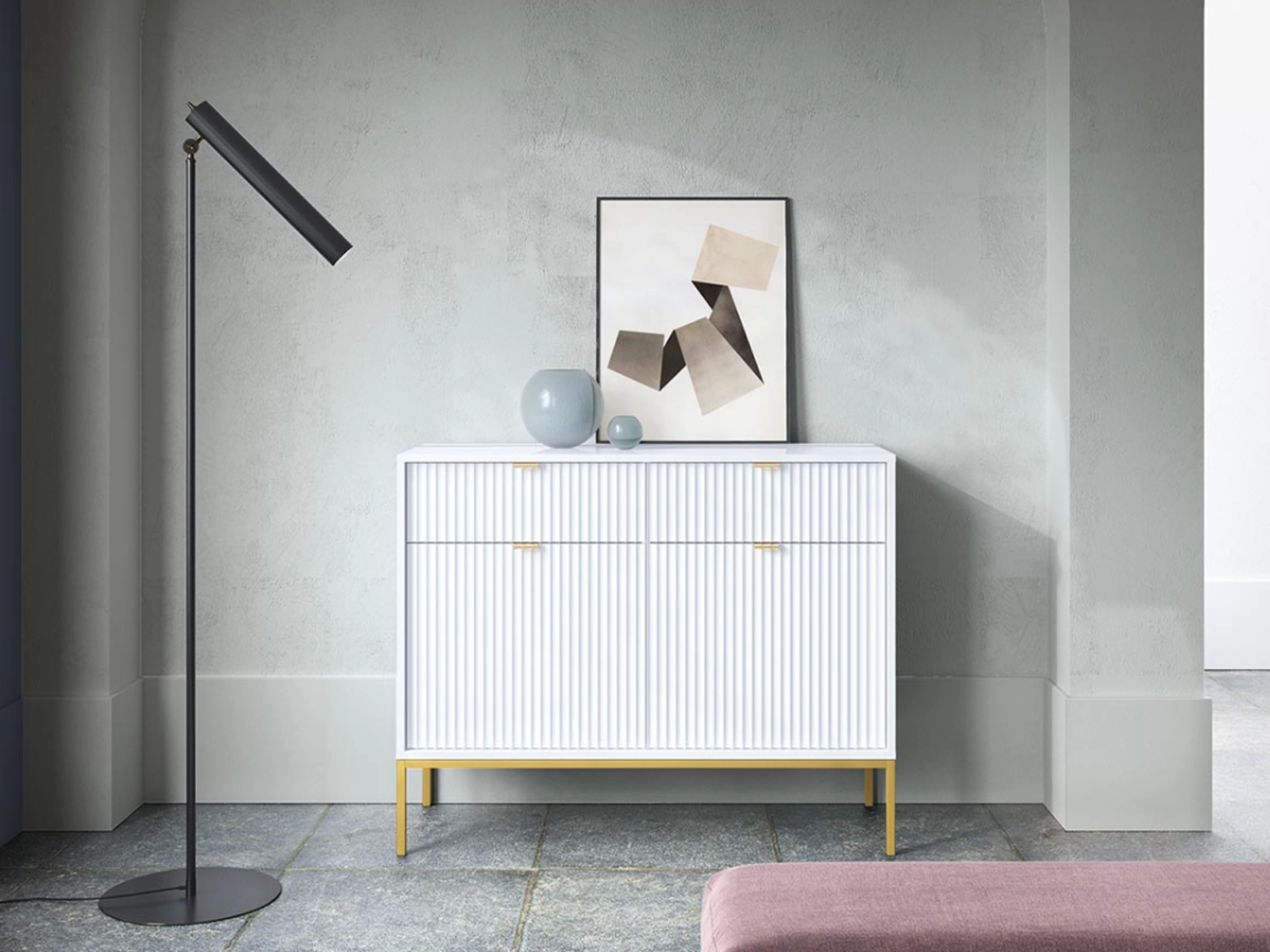 Do wyboru są dwie eleganckie wersje podstawy – czarna lub złota, które doskonale komponują się z komodą w kolorach czarnym, białym, szarym i zielonym, dodając każdemu z tych odcieni unikalnego charakteru i subtelnej klasy.