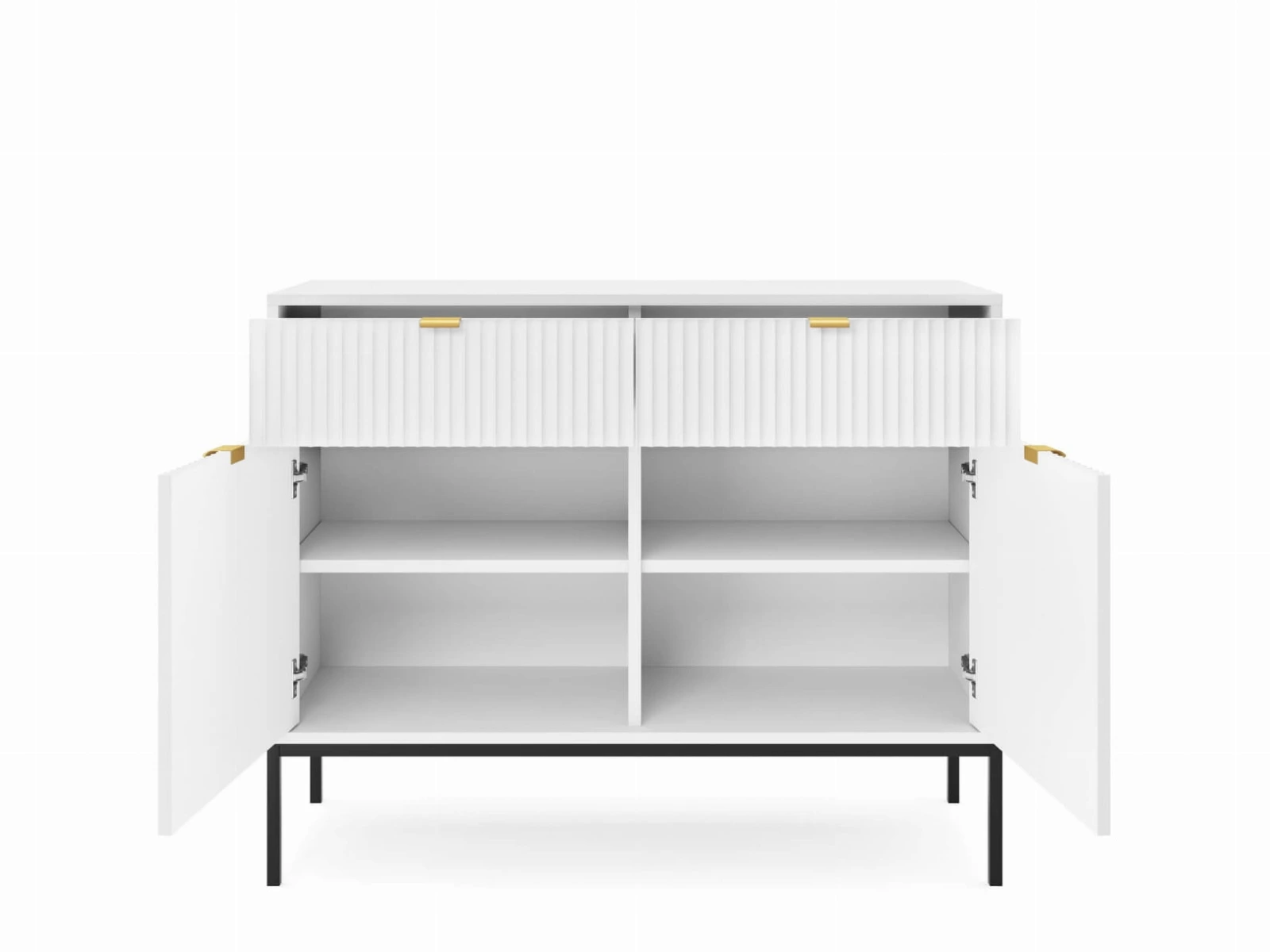 Dzięki przemyślanemu układowi – dwóm pojemnym szafkom z półkami – komoda Bari oferuje mnóstwo miejsca do przechowywania. Bez trudu uporządkujesz ubrania, dokumenty lub inne domowe akcesoria, dbając o porządek i estetykę swojego salonu, sypialni czy przedpokoju. Elegancką, lekką formę podkreśla czarny metalowy stelaż, który nie tylko nadaje meblowi nowoczesny charakter, ale także umożliwia wygodne sprzątanie przestrzeni pod komodą.