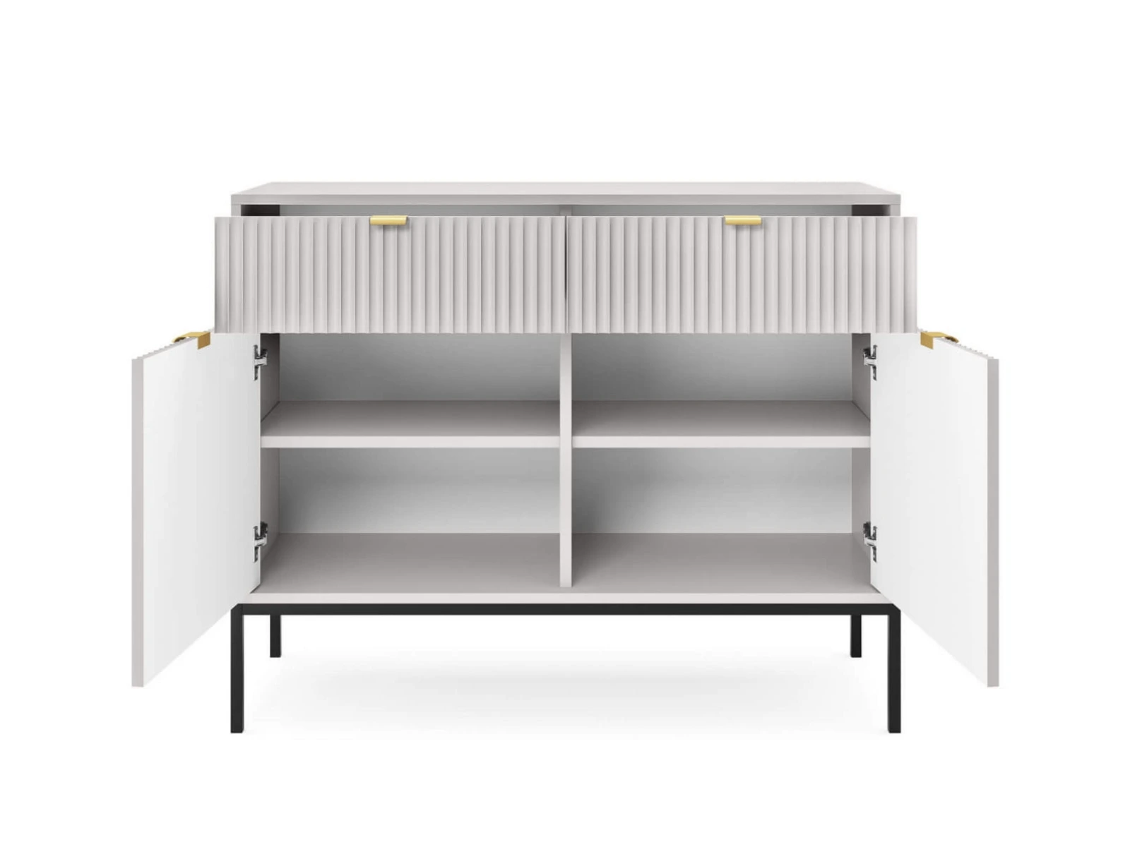 Dzięki przemyślanemu układowi – dwóm pojemnym szafkom z półkami – komoda Bari oferuje mnóstwo miejsca do przechowywania. Bez trudu uporządkujesz ubrania, dokumenty lub inne domowe akcesoria, dbając o porządek i estetykę swojego salonu, sypialni czy przedpokoju. Elegancką, lekką formę podkreśla czarny metalowy stelaż, który nie tylko nadaje meblowi nowoczesny charakter, ale także umożliwia wygodne sprzątanie przestrzeni pod komodą.