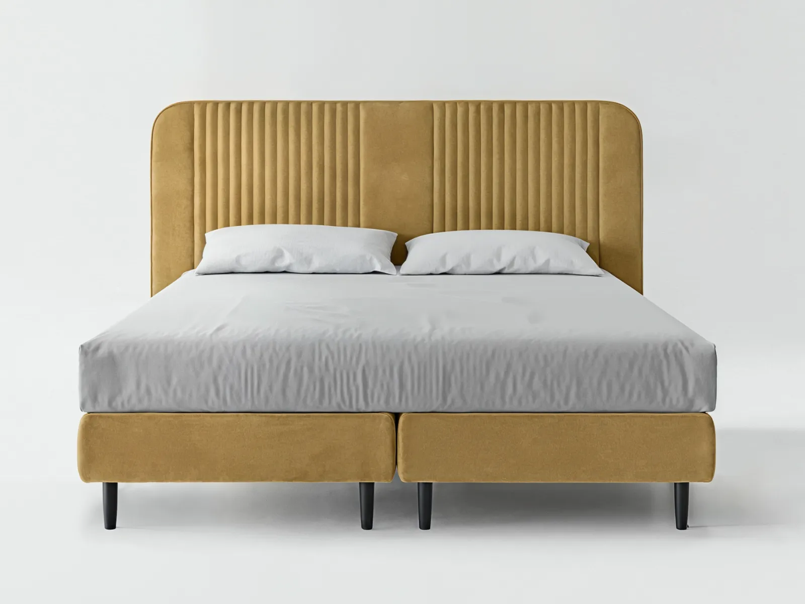 Żółta tkanina welurowa wnosi do wnętrza ciepło i energię, czyniąc łóżko DONAU świetnym wyborem do sypialni w stylu nowoczesnym, glamour czy skandynawskim. Zaokrąglone wezgłowie z pionowymi przeszyciami dodaje elegancji i sprawia, że łóżko prezentuje się wyjątkowo efektownie.