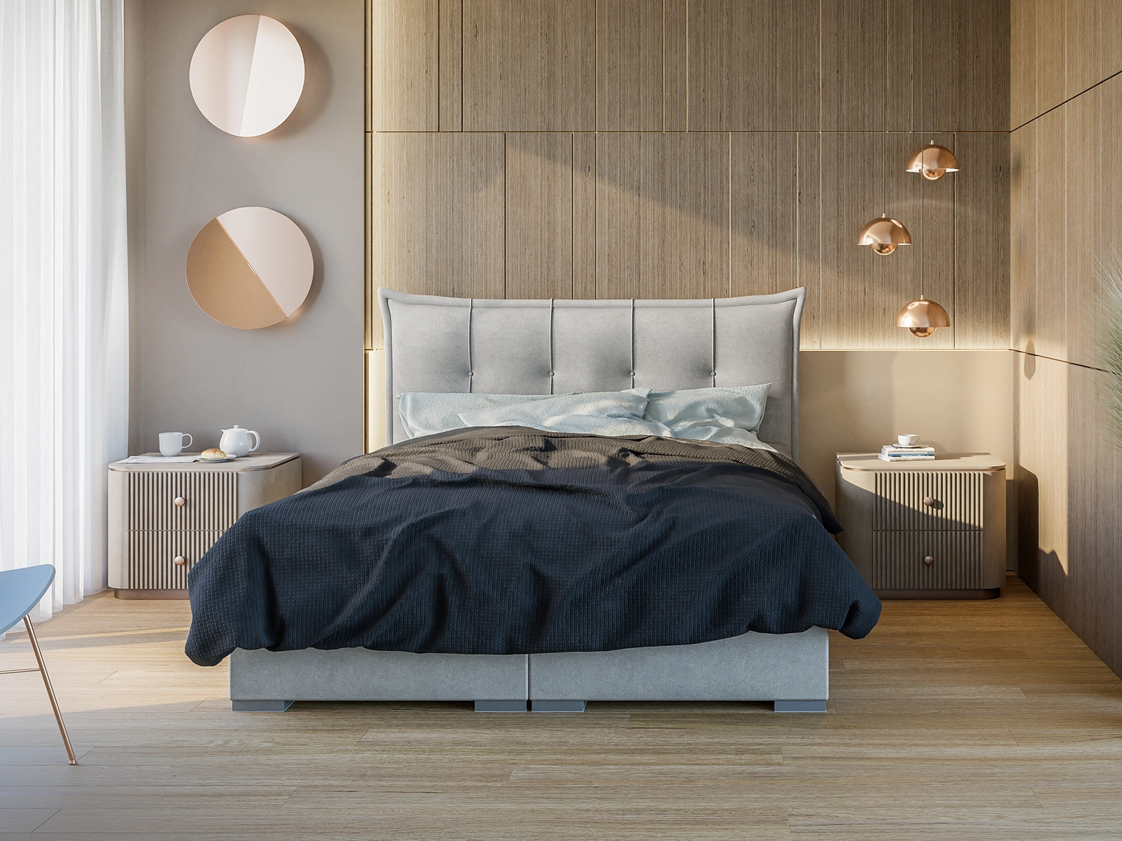 Niebieski kolor tkaniny inspirowany jest barwami oceanu i nieba – wprowadza do wnętrza spokój, świeżość i harmonię, tworząc idealne warunki do relaksu. Miękkie wezgłowie z eleganckimi przeszyciami i subtelnymi detalami dodaje łóżku klasy i stylu, stając się centralnym punktem każdej sypialni.