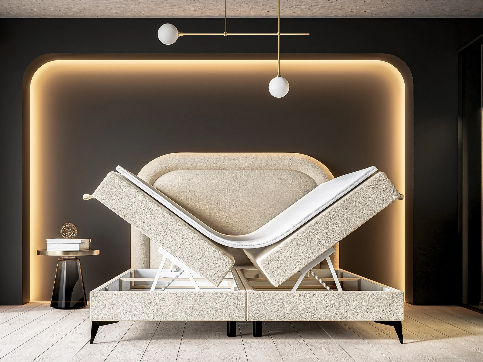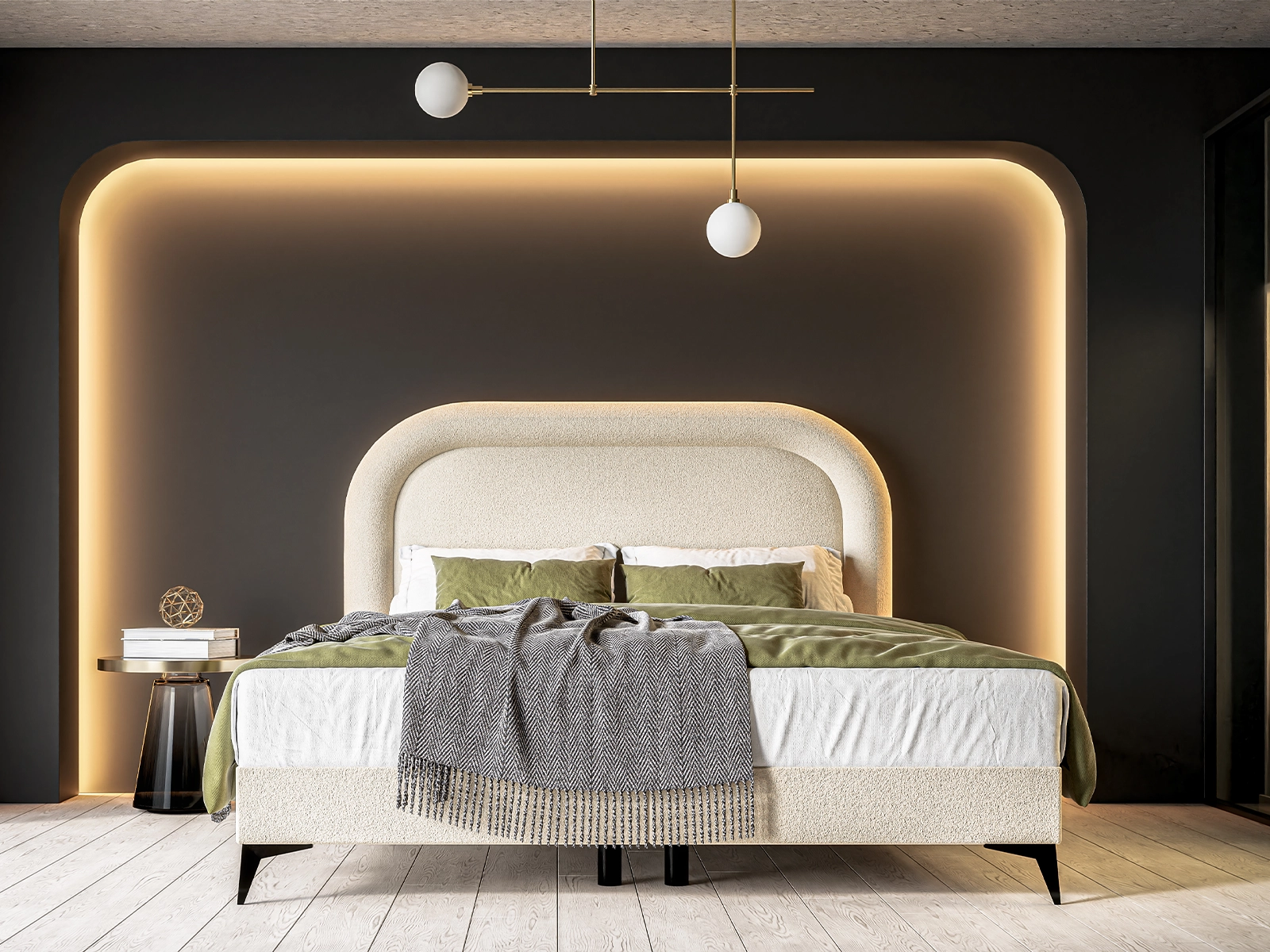 Opływowy zagłówek nadaje łóżku wyjątkowego, stylowego charakteru i staje się centralnym punktem wnętrza. Starannie wykończona tapicerka z odpornej na zabrudzenia tkaniny sprawia, że łóżko jest zarówno estetyczne, jak i łatwe w utrzymaniu.