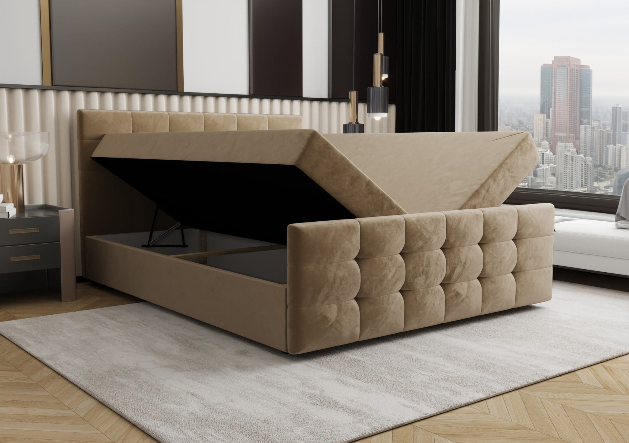 Łóżko kontynentalne 140x200 PURO beżowe z pojemnikiem oraz materacem bonellowym