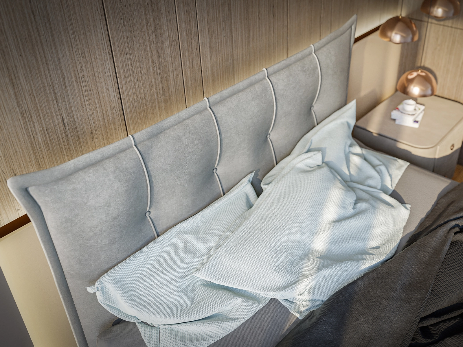 Niebieski kolor tkaniny inspirowany jest barwami oceanu i nieba – wprowadza do wnętrza spokój, świeżość i harmonię, tworząc idealne warunki do relaksu. Miękkie wezgłowie z eleganckimi przeszyciami i subtelnymi detalami dodaje łóżku klasy i stylu, stając się centralnym punktem każdej sypialni.
