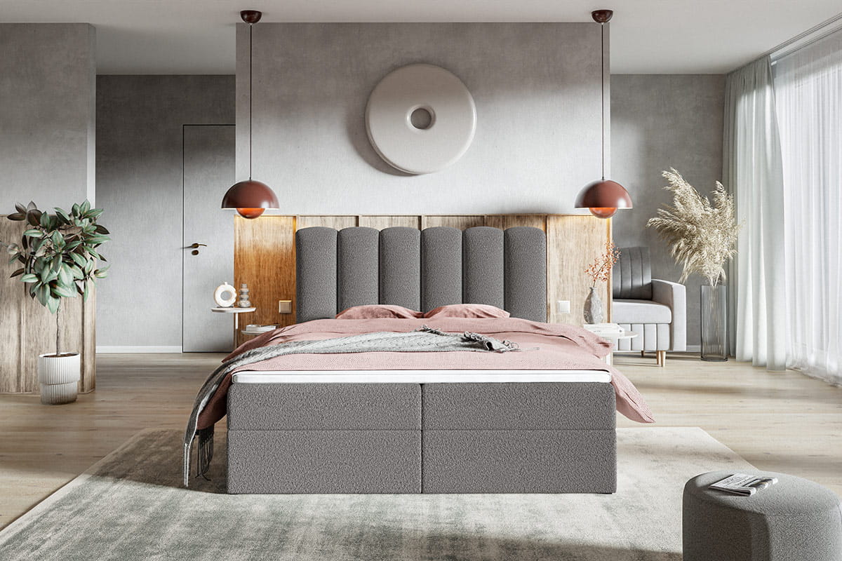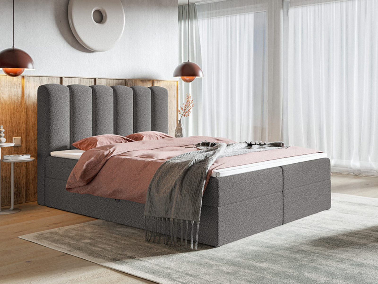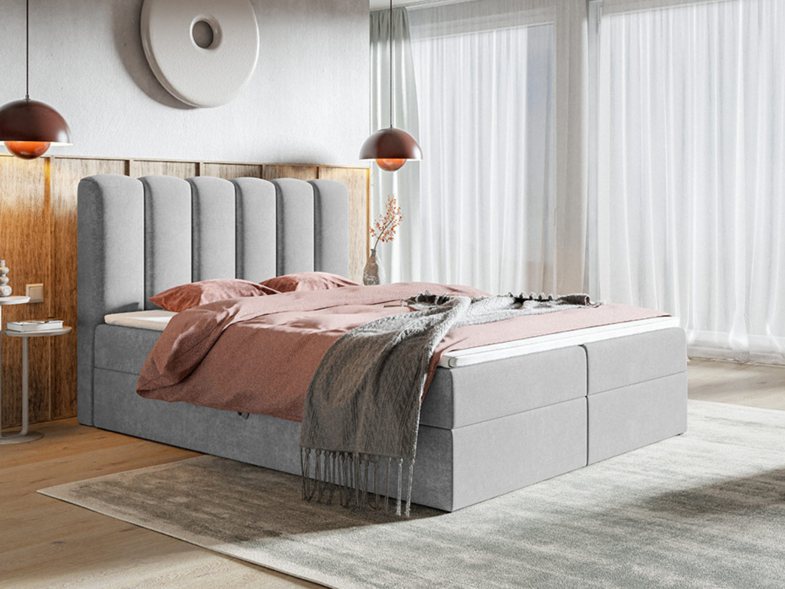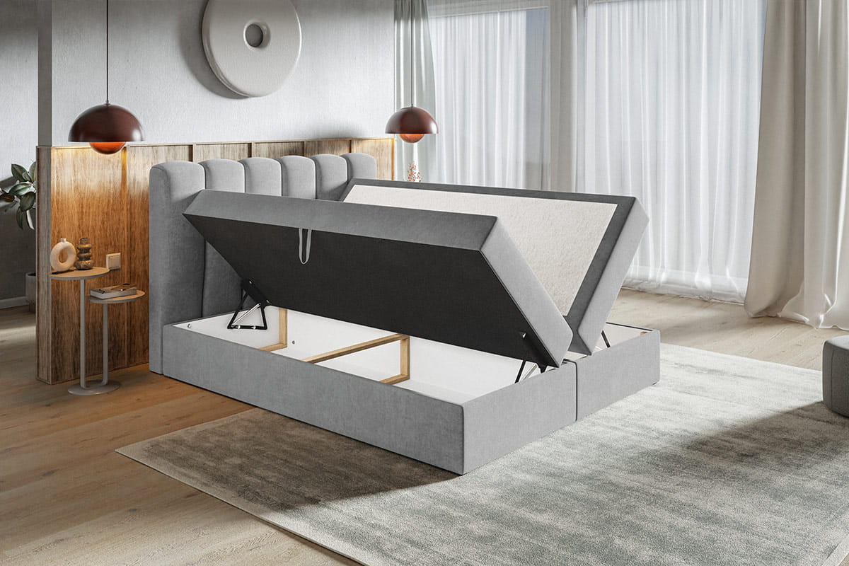 Łóżko kontynentalne 160x200 AMOR z pojemnikiem oraz materacem bonellowym szary welur