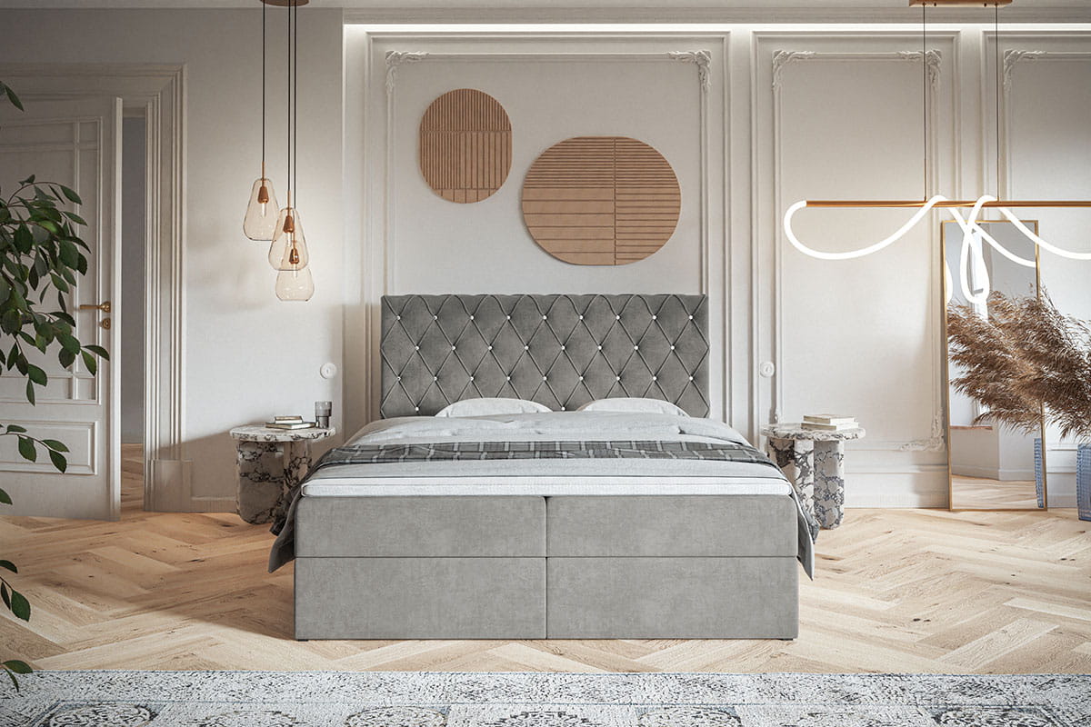 Łóżko kontynentalne 160x200 KELLY z pojemnikiem oraz materacem bonellowym szary welur