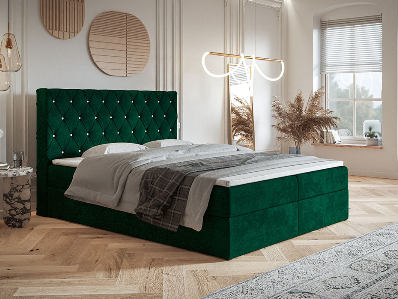Łóżko kontynentalne Kelly to połączenie komfortu, elegancji i funkcjonalności, stworzone z myślą o najbardziej wymagających użytkownikach. Wyposażone w dwa pojemniki na pościel, zapewnia wygodne rozwiązanie do przechowywania kołder, poduszek i innych tekstyliów, pomagając utrzymać porządek w sypialni.