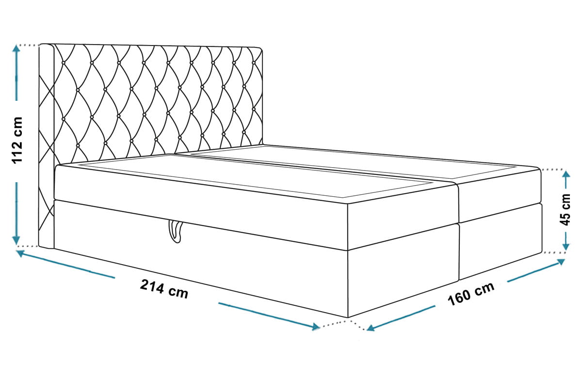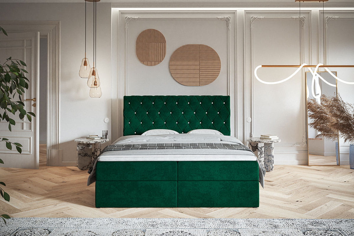 Kluczowym elementem designu łóżka Kelly jest ozdobny zagłówek, zdobiony przeszyciami i eleganckimi cyrkoniami, które dodają wnętrzu wyrafinowanego blasku. Materac bonellowy, charakteryzujący się trwałością i odpowiednią sprężystością, gwarantuje komfortowy sen i wsparcie dla kręgosłupa. Solidna konstrukcja kontynentalna zwiększa wygodę, a całość tapicerowana jest miękką, wytrzymałą tkaniną, co czyni łóżko Kelly idealnym wyborem do nowoczesnych i klasycznych aranżacji wnętrz.