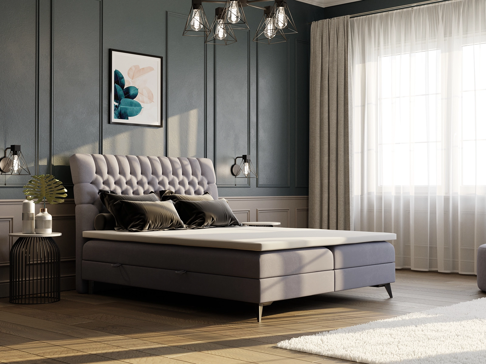 Łóżko kontynentalne Medison to doskonały wybór dla osób ceniących sobie komfort i elegancję. Wykonane z szarej tkaniny, charakteryzuje się nowoczesnym designem i funkcjonalnością. Posiada dwa pojemniki na pościel otwierane od boku, co ułatwia przechowywanie i utrzymanie porządku. Materac bonellowy zapewnia wyjątkowy komfort snu, a dodatkowy topper zwiększa wygodę użytkowania.