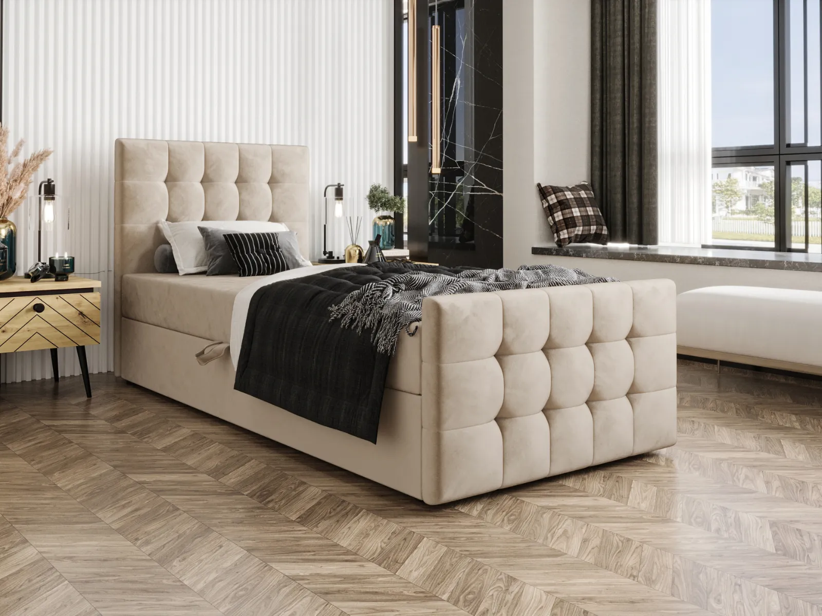 Łóżko młodzieżowe 90x200 ARTO z pojemnikiem oraz materacem bonellowym beżowe welurowe