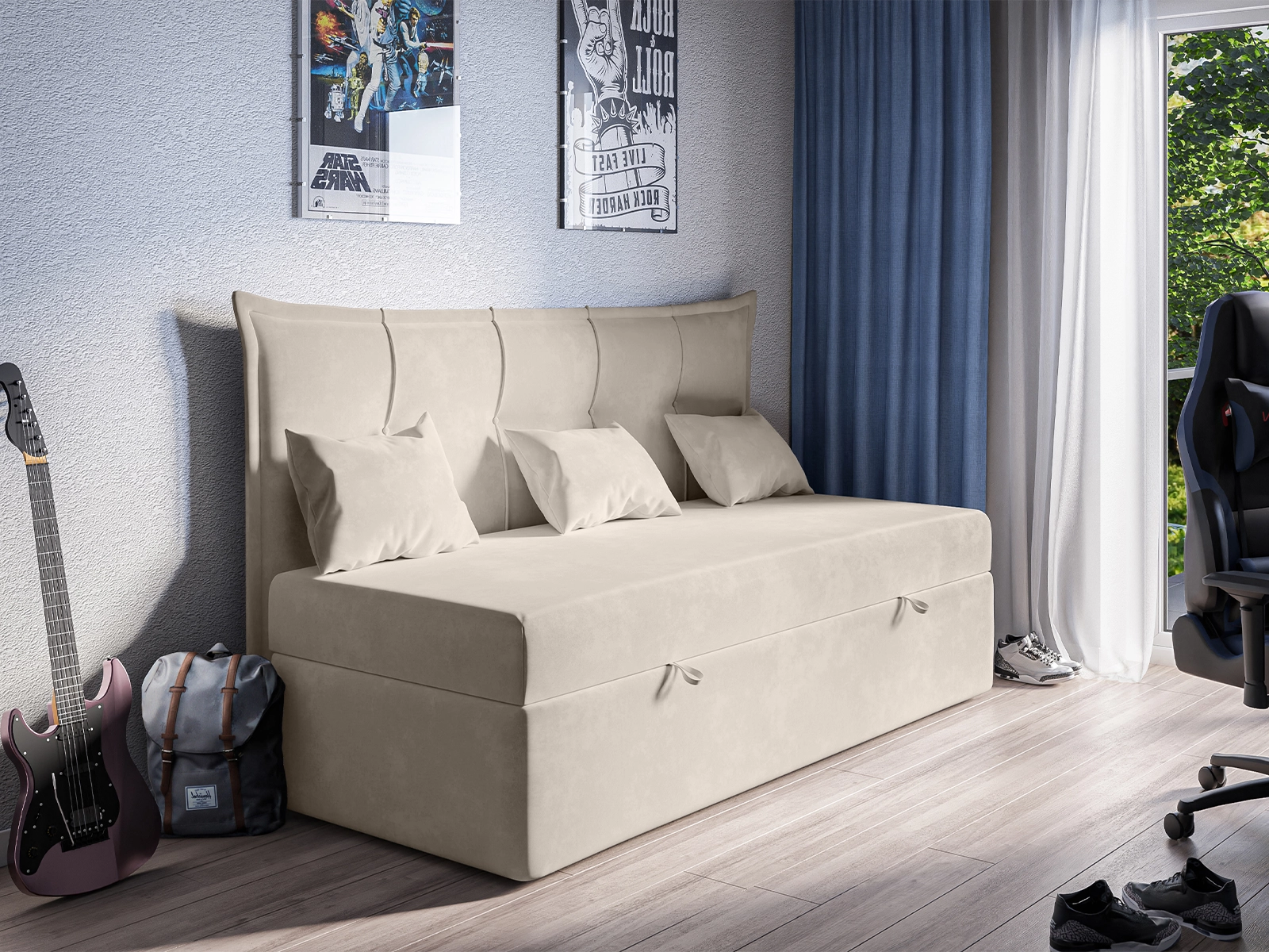 Łóżko młodzieżowe 90x200 CLARA z pojemnikiem oraz materacem bonellowym beżowe welurowe