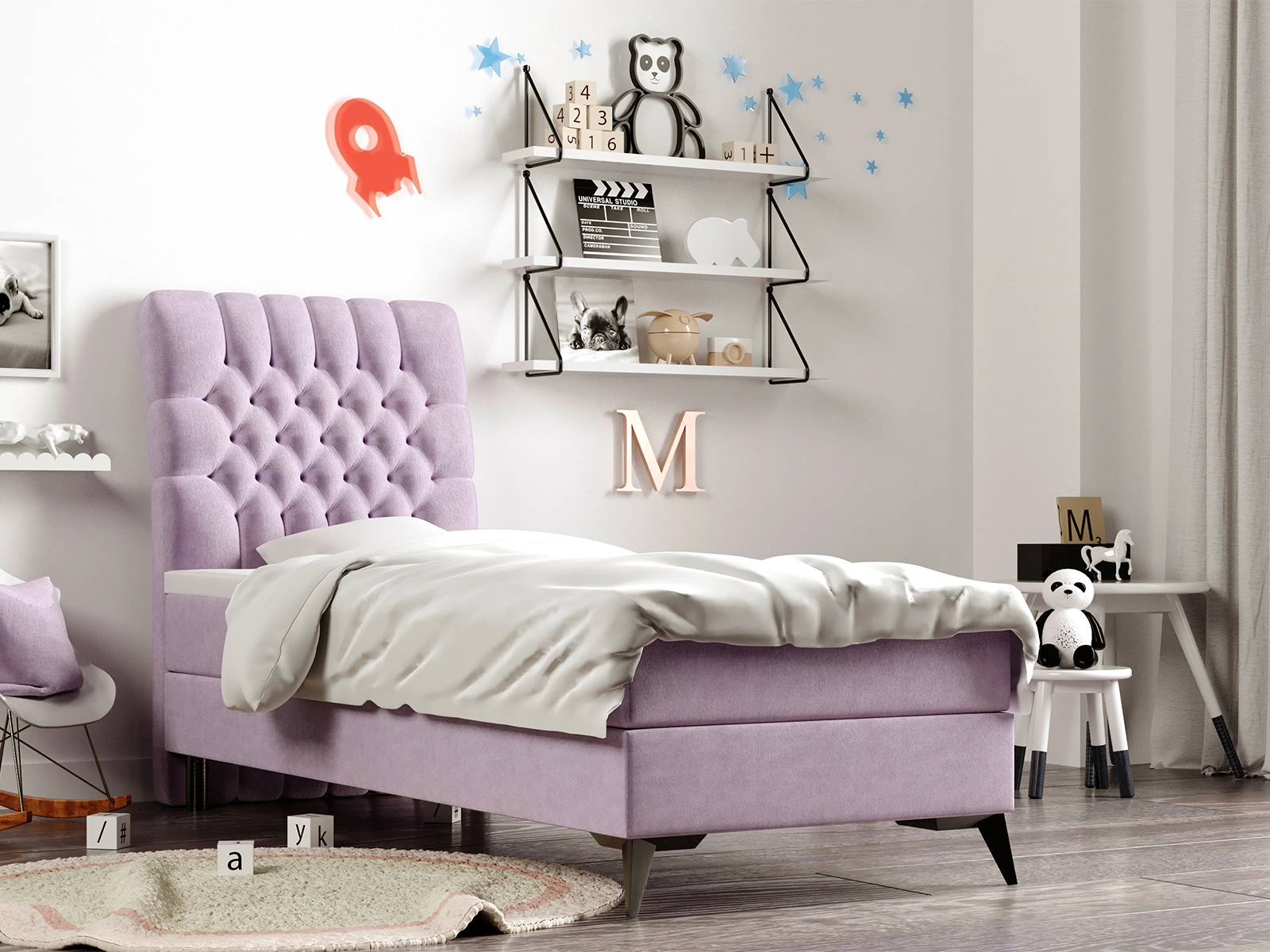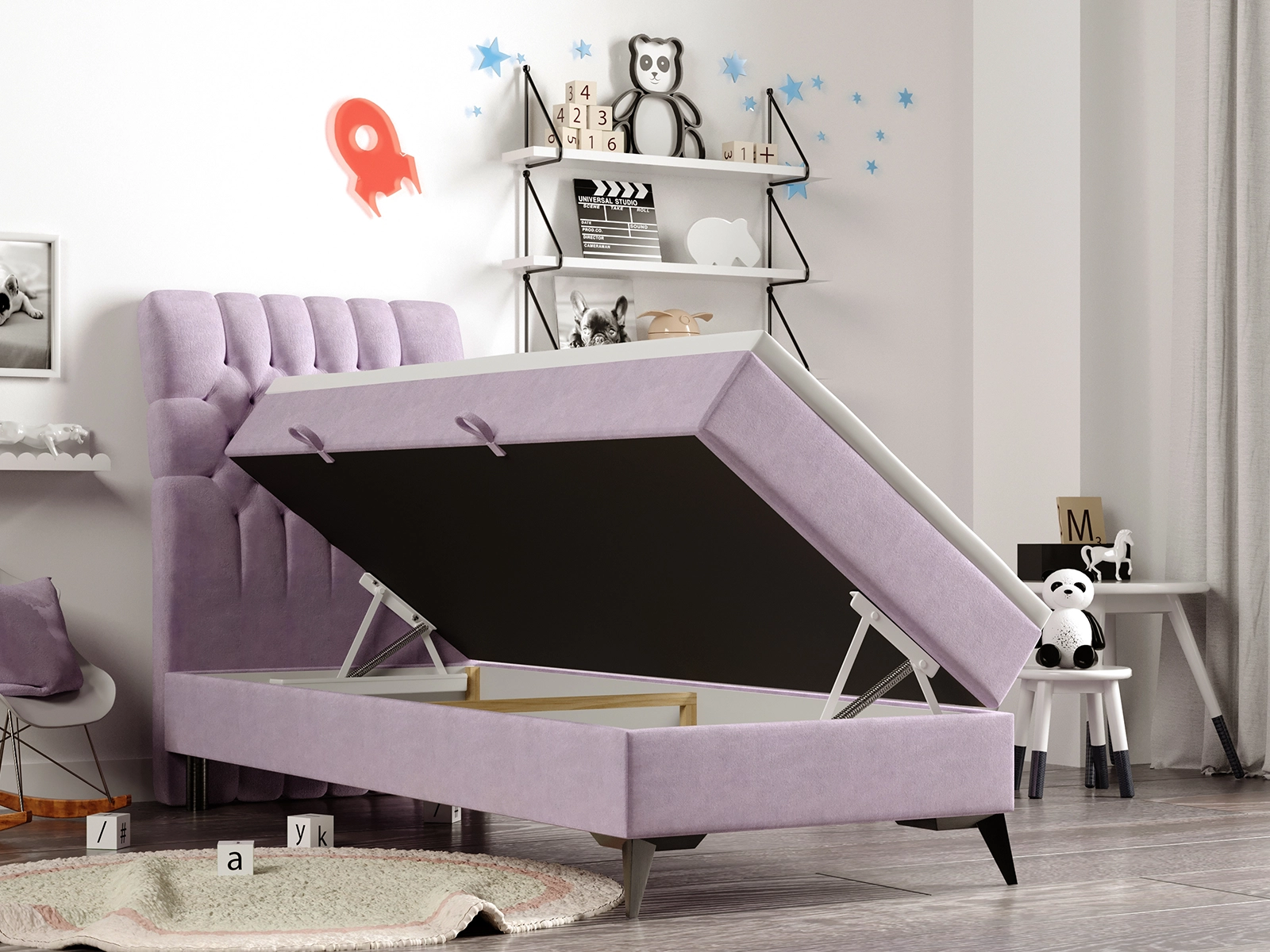 Łóżko młodzieżowe 90x200 FINNA z pojemnikiem oraz materacem bonellowym liliowe welurowe