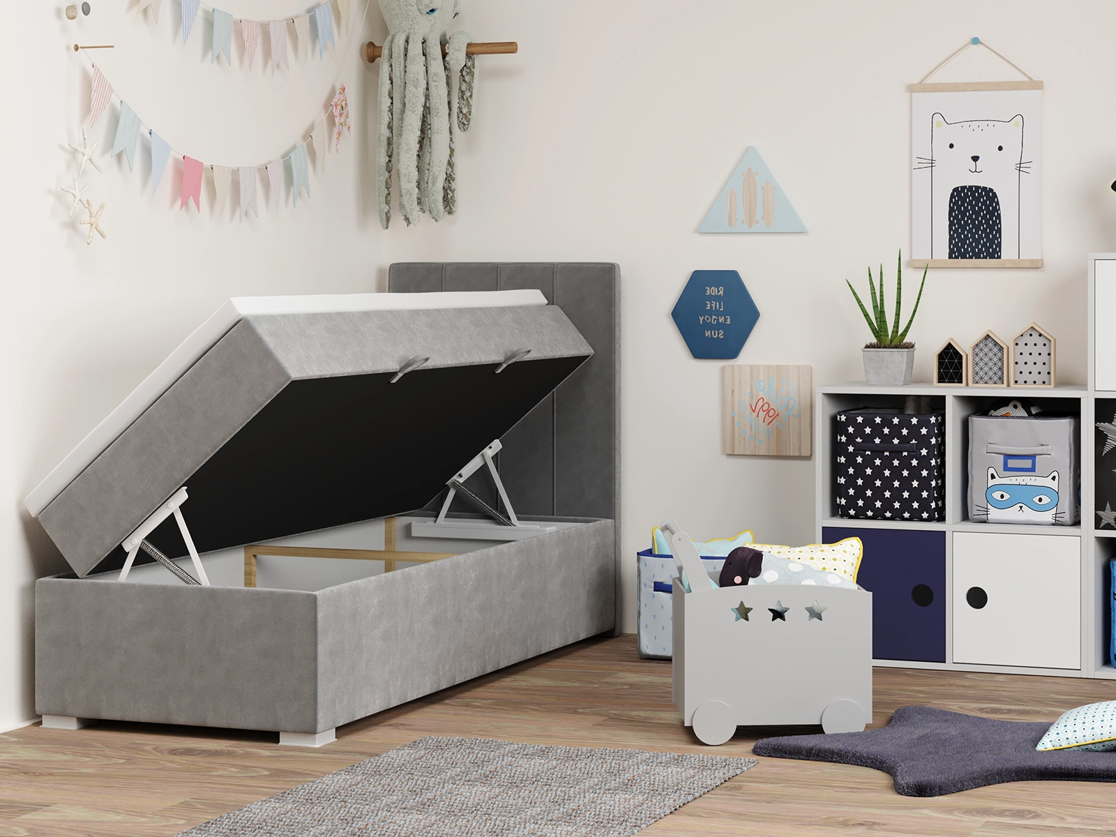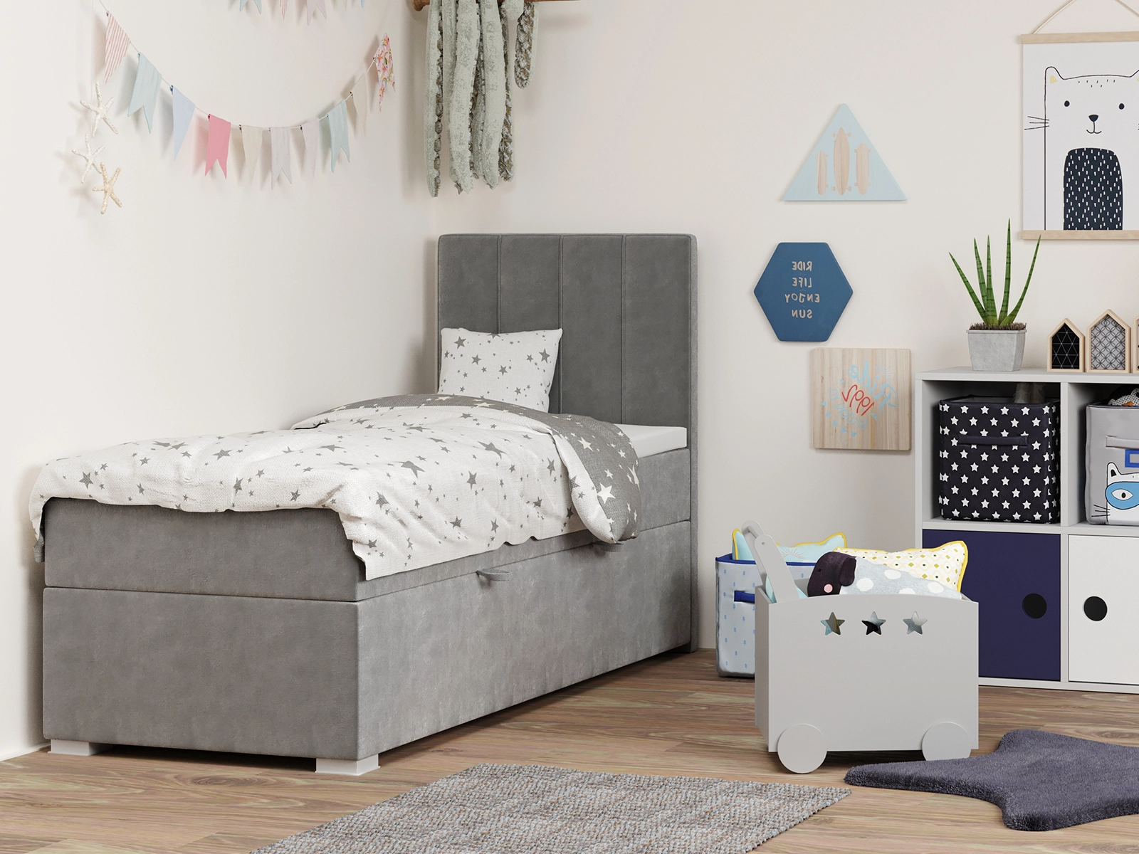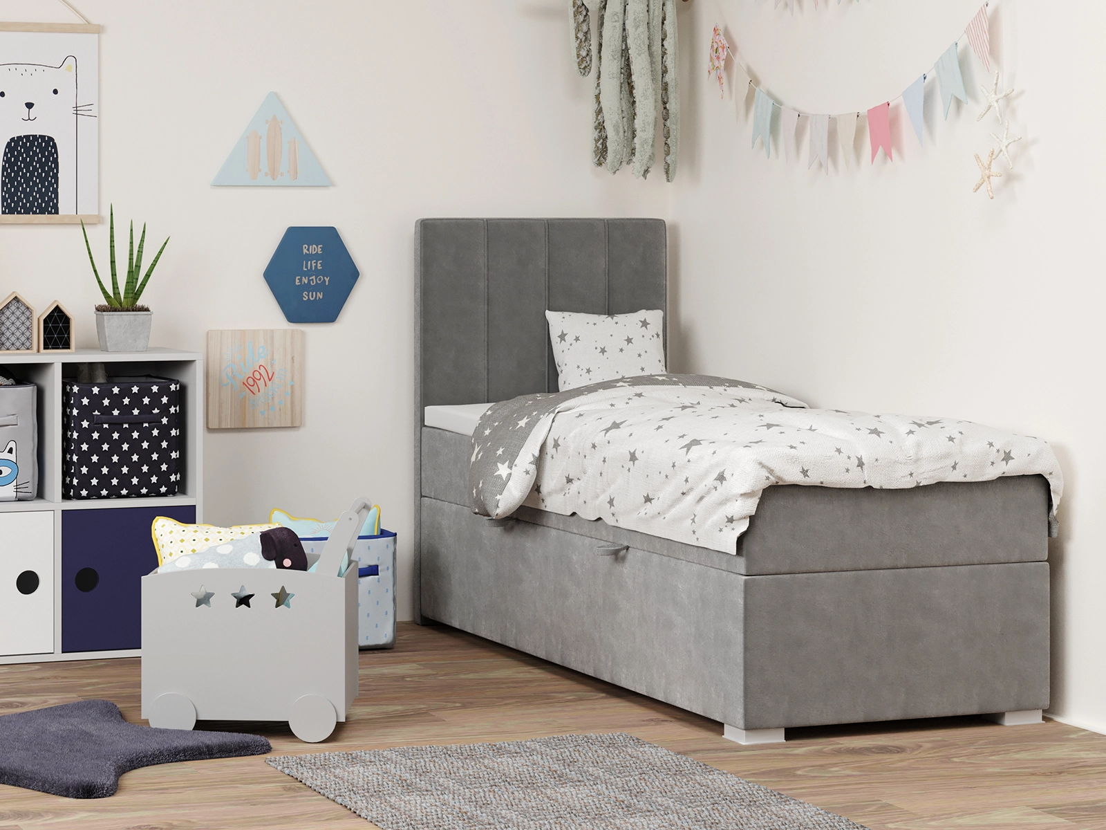 Łóżko młodzieżowe 90x200 LENARD z pojemnikiem oraz materacem bonellowym szare welurowe