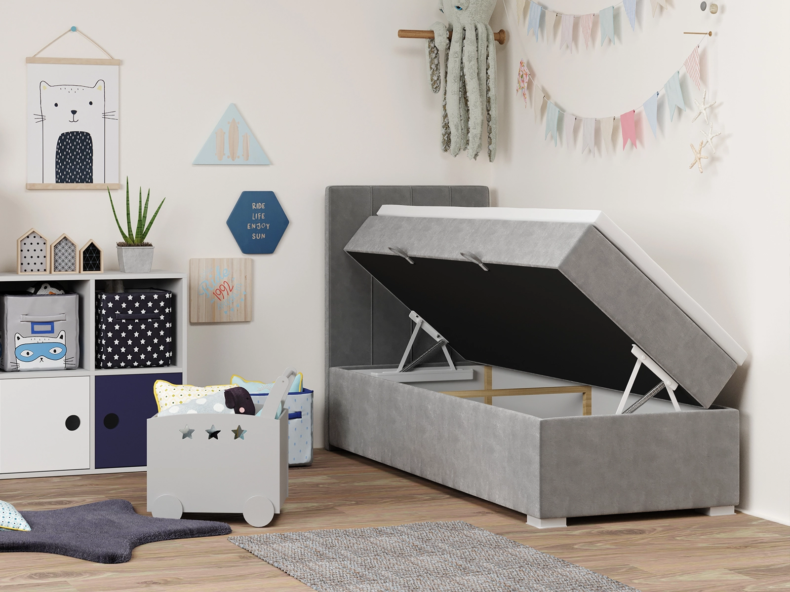 Łóżko młodzieżowe 90x200 LENARD szara tkanina z pojemnikiem oraz materacem bonellowym