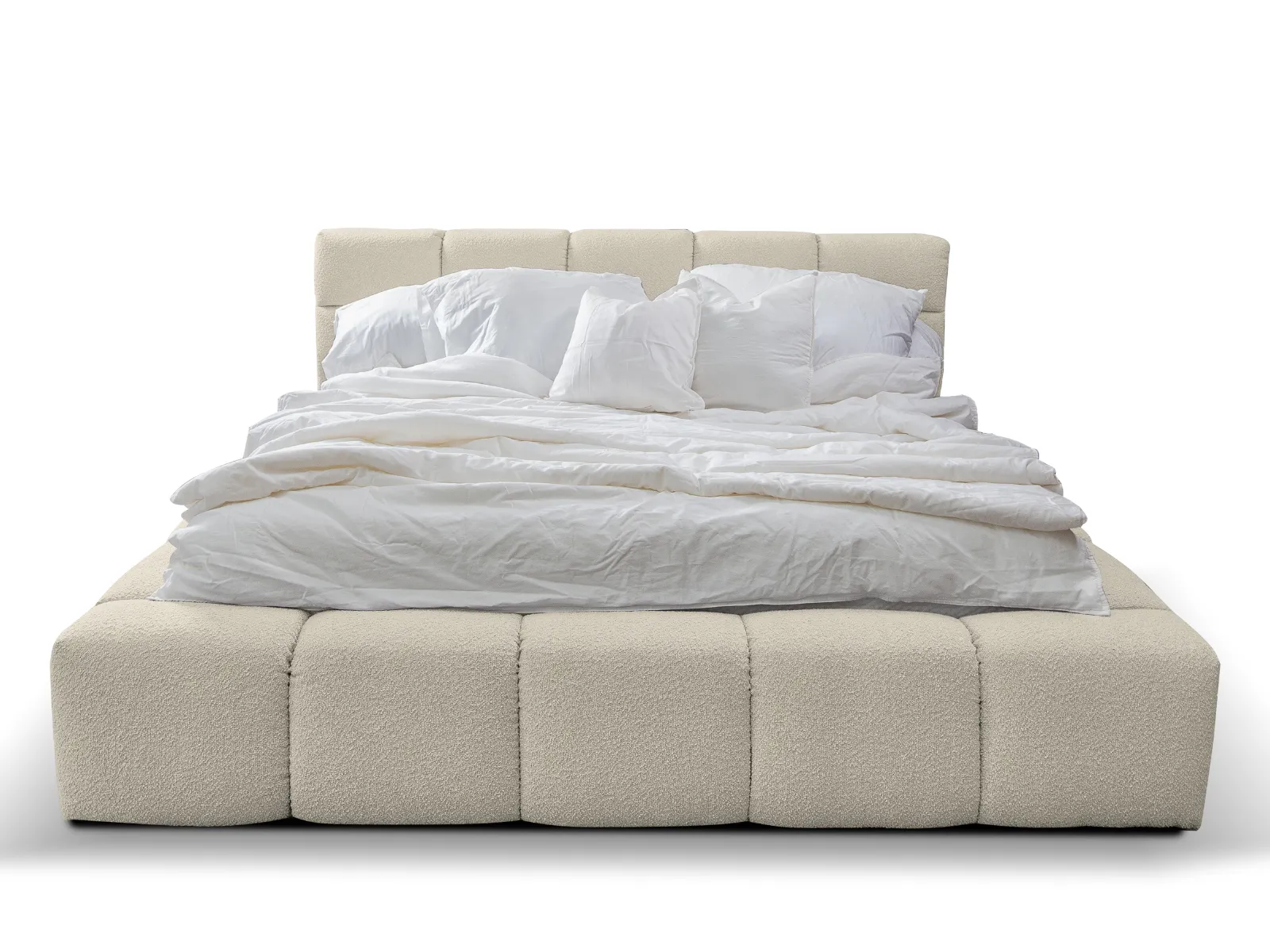 Miękka i wytrzymała tapicerka wykonana z tkaniny boucle w eleganckim szarym kolorze podkreśla nowoczesny charakter łóżka Lilac. Starannie wykonane detale oraz dopracowane proporcje sprawiają, że łóżko prezentuje się stylowo, elegancko i luksusowo.