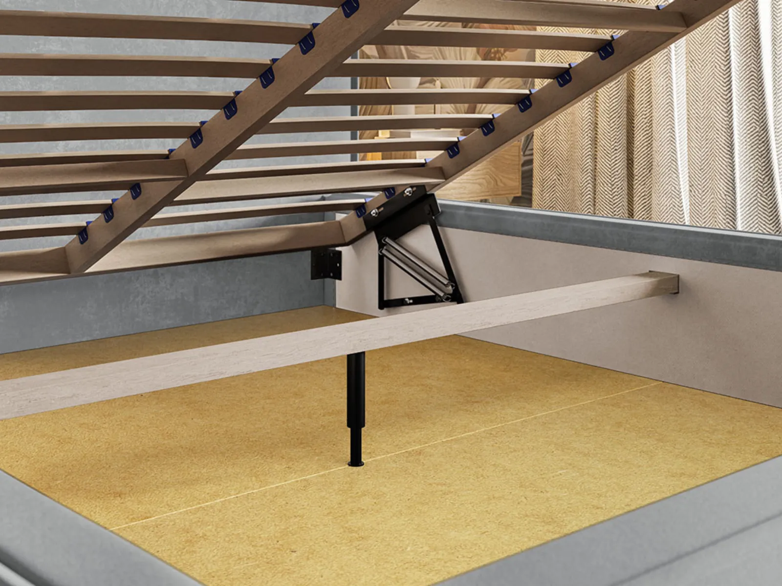 - Stelaż drewniany w standardzie – elastyczne listwy zapewniają odpowiednie podparcie dla materaca oraz prawidłową wentylację.