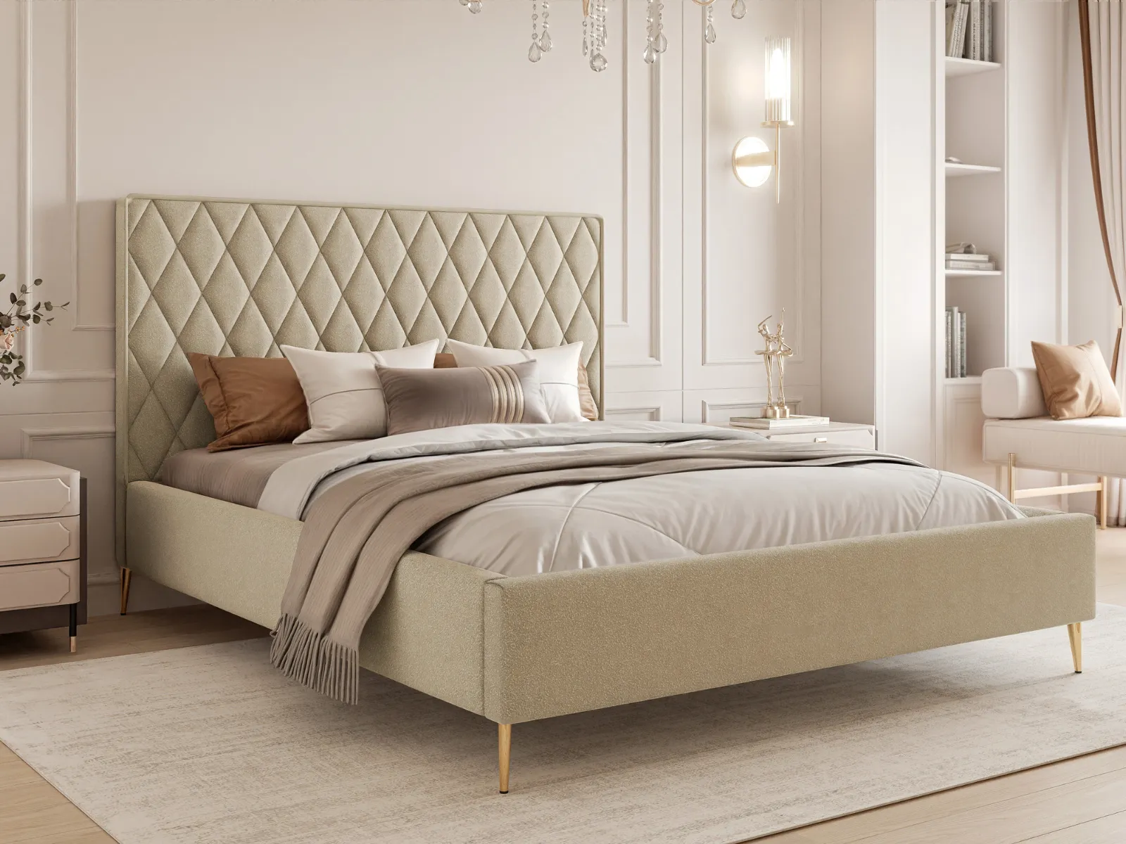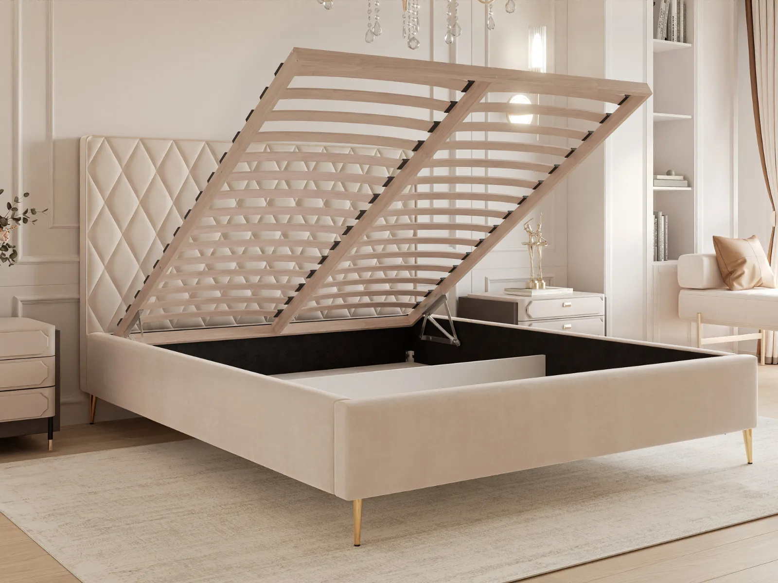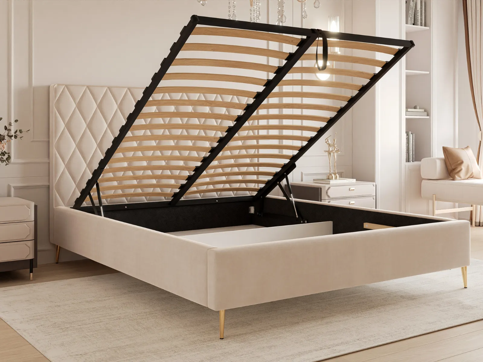 Łóżko tapicerowane 120x200 MORA z pojemnikiem i stelażem na wysokich złotych nogach, beżowy welur