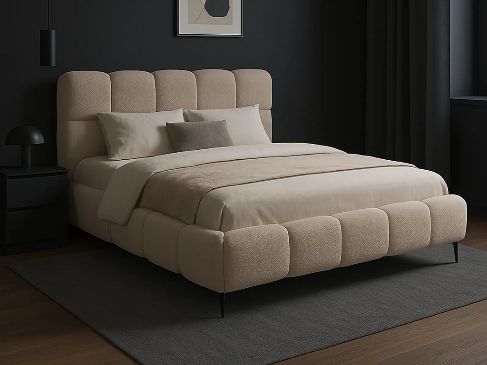 Łóżko ORNELLA wyróżnia się miękką, pikowaną ramą i eleganckim zagłówkiem, które zostały wykończone w niezwykle modnej tkaninie typu bouclé (bukla). Jej pętelkowa struktura przypomina futerko baranka, jest przyjemna w dotyku i bardzo odporna na codzienne użytkowanie. Beżowa kolorystyka dodaje wnętrzu przytulności i nowoczesnego charakteru.
