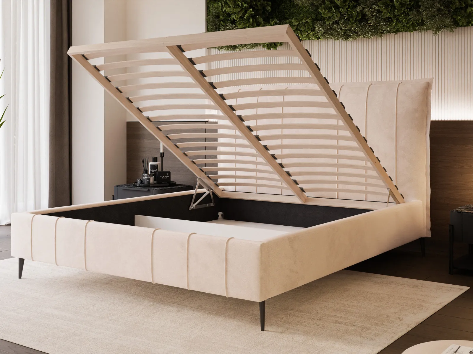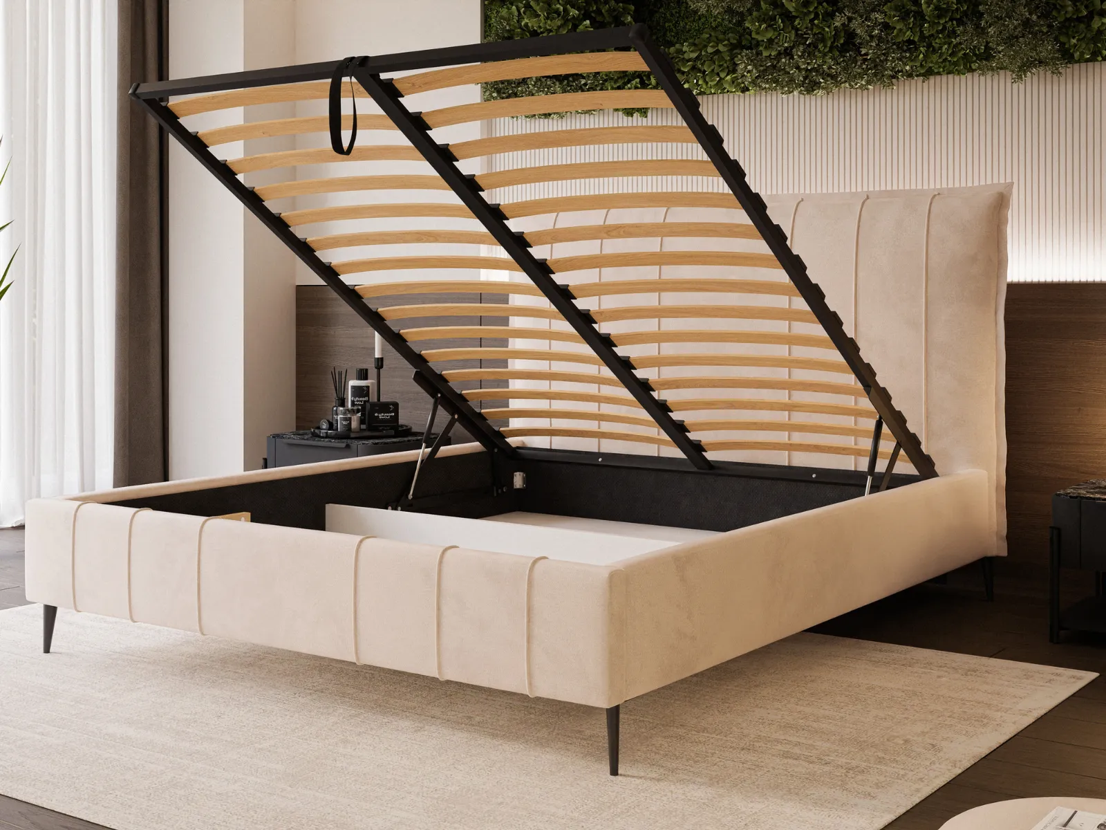 Dla osób ceniących praktyczne rozwiązania dostępna jest opcja metalowego stelaża z siłownikami gazowymi, który pozwala łatwo i lekko unieść materac, dając dostęp do pojemnego schowka na pościel.