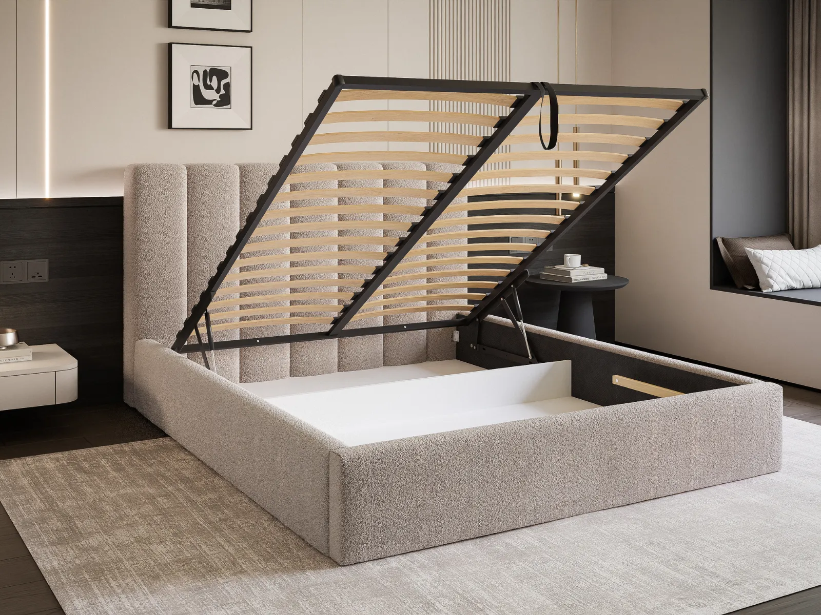 Łóżko tapicerowane 140x200 ARDELA z pojemnikiem i stelażem beżowe boucle