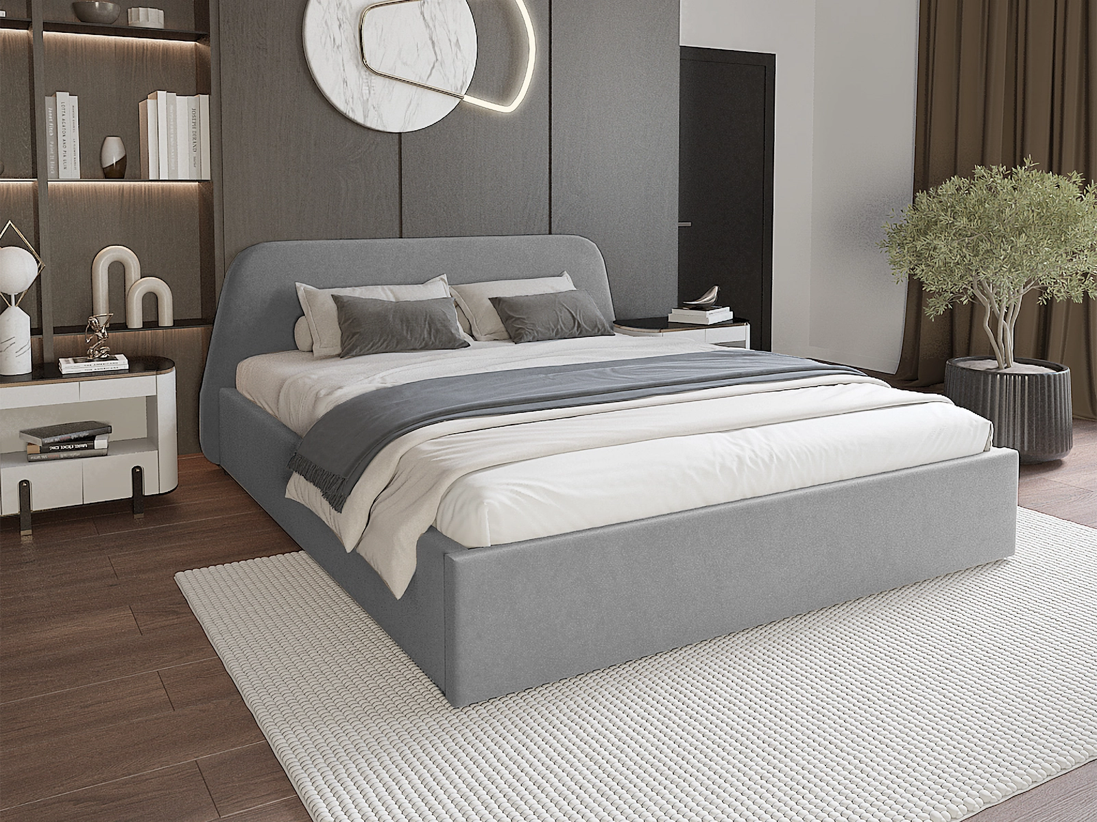 Łóżko Bruno wyróżnia się eleganckim, opływowym zagłówkiem, który dodaje wnętrzu wyjątkowego charakteru i zapewnia wygodne podparcie podczas wieczornego relaksu. Miękka tapicerka sprawia, że łóżko prezentuje się niezwykle luksusowo i przytulnie, tworząc idealne miejsce do odpoczynku.