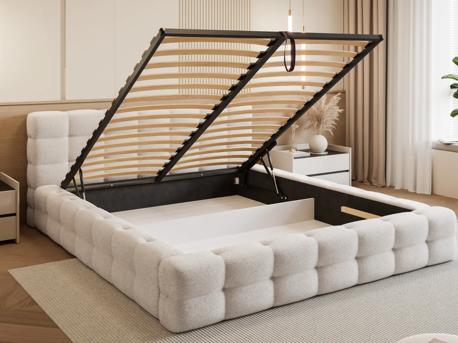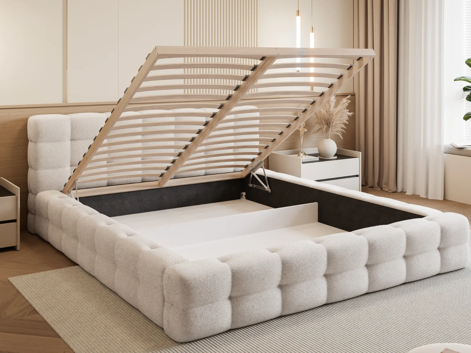 Łóżko tapicerowane 140x200 LARIS z pojemnikiem i stelażem, beżowe boucle