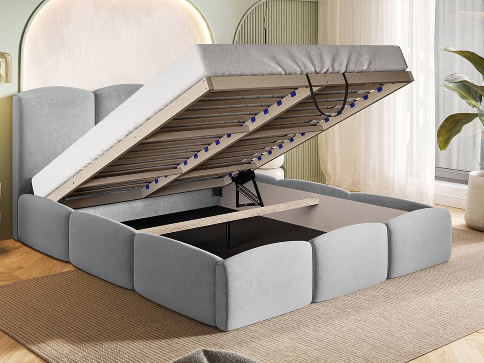 Łóżko Mahia Slim jest wyposażone w praktyczny pojemnik na pościel z dnem materiałowym oraz solidny stelaż, co zapewnia wygodę i trwałość na lata. Beżowy welur dodaje elegancji i subtelności, idealnie wpasowując się w nowoczesne wnętrze.