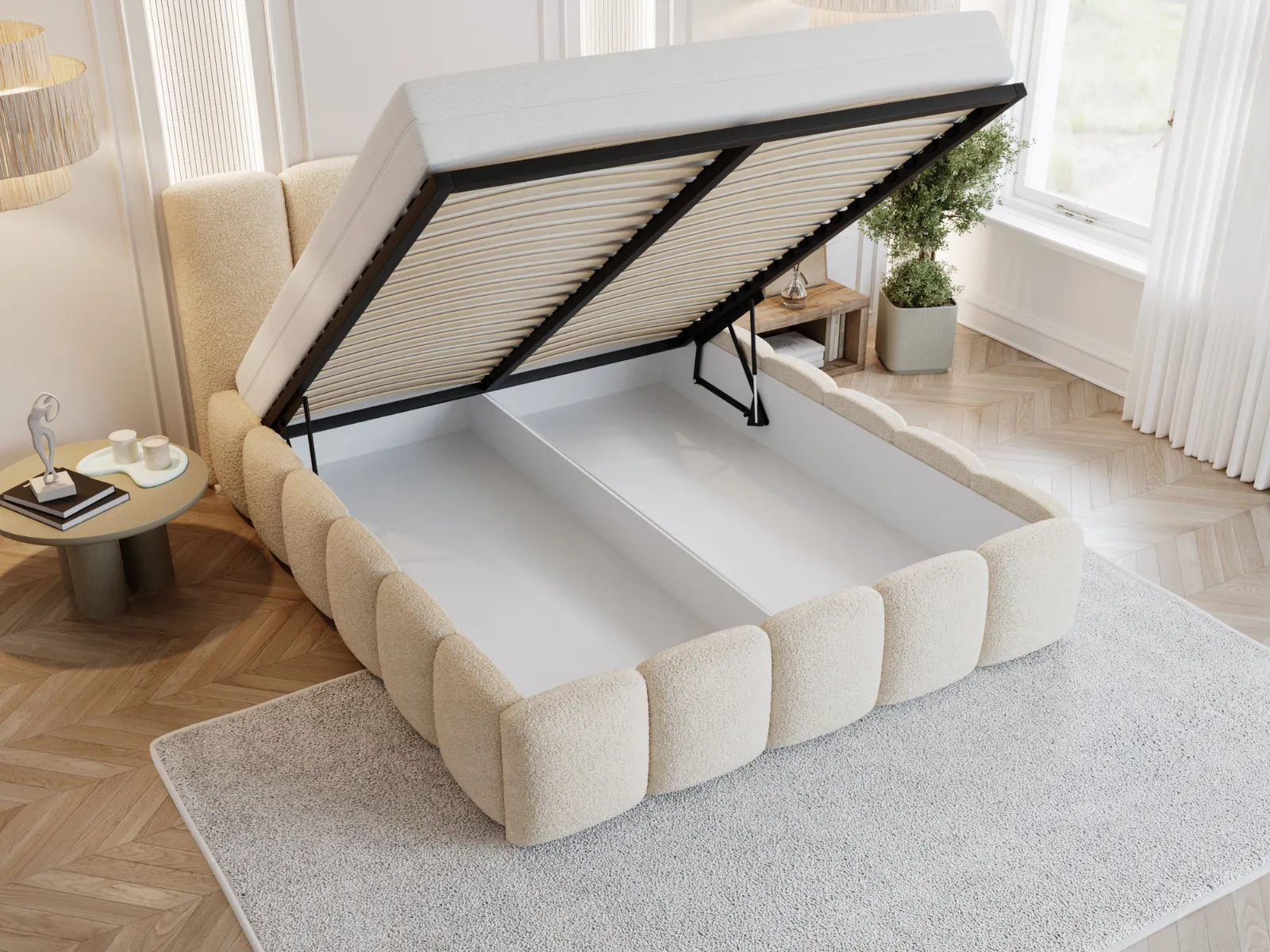 Łóżko tapicerowane 140x200 MELIORA z pojemnikiem i metalowym stelażem, beżowe boucle