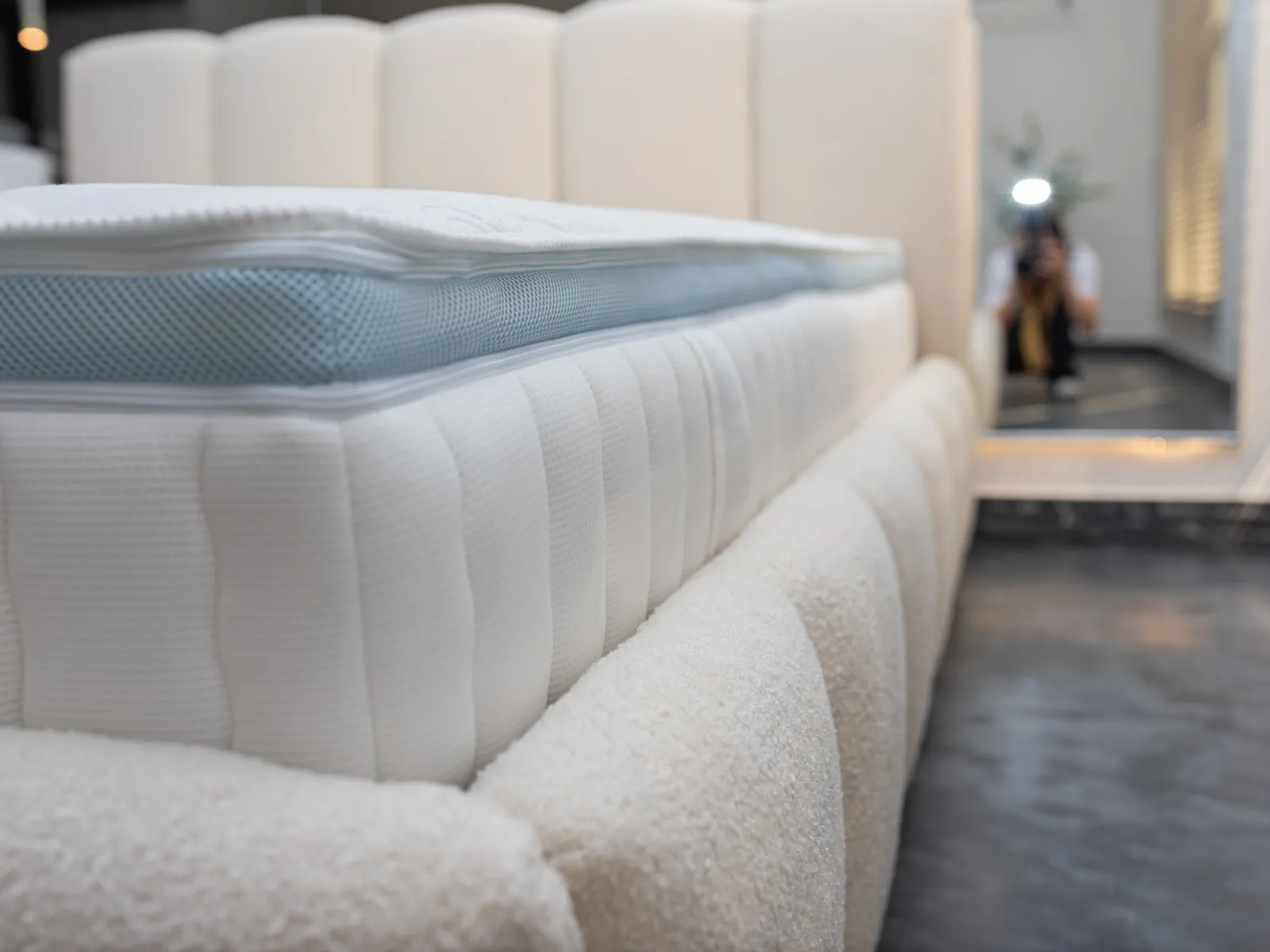 Meliora to łóżko tapicerowane stworzone z myślą o osobach, które cenią sobie designerskie wnętrza i komfort na najwyższym poziomie. Miękka, pikowana rama łóżka wykończona została w tkaninie typu bouclé, która jest nie tylko przyjemna w dotyku, ale również niezwykle modna i odporna na codzienne użytkowanie. Zaokrąglone kształty i elegancki zagłówek nadają wnętrzu przytulności, jednocześnie wpisując się w aktualne trendy aranżacyjne.