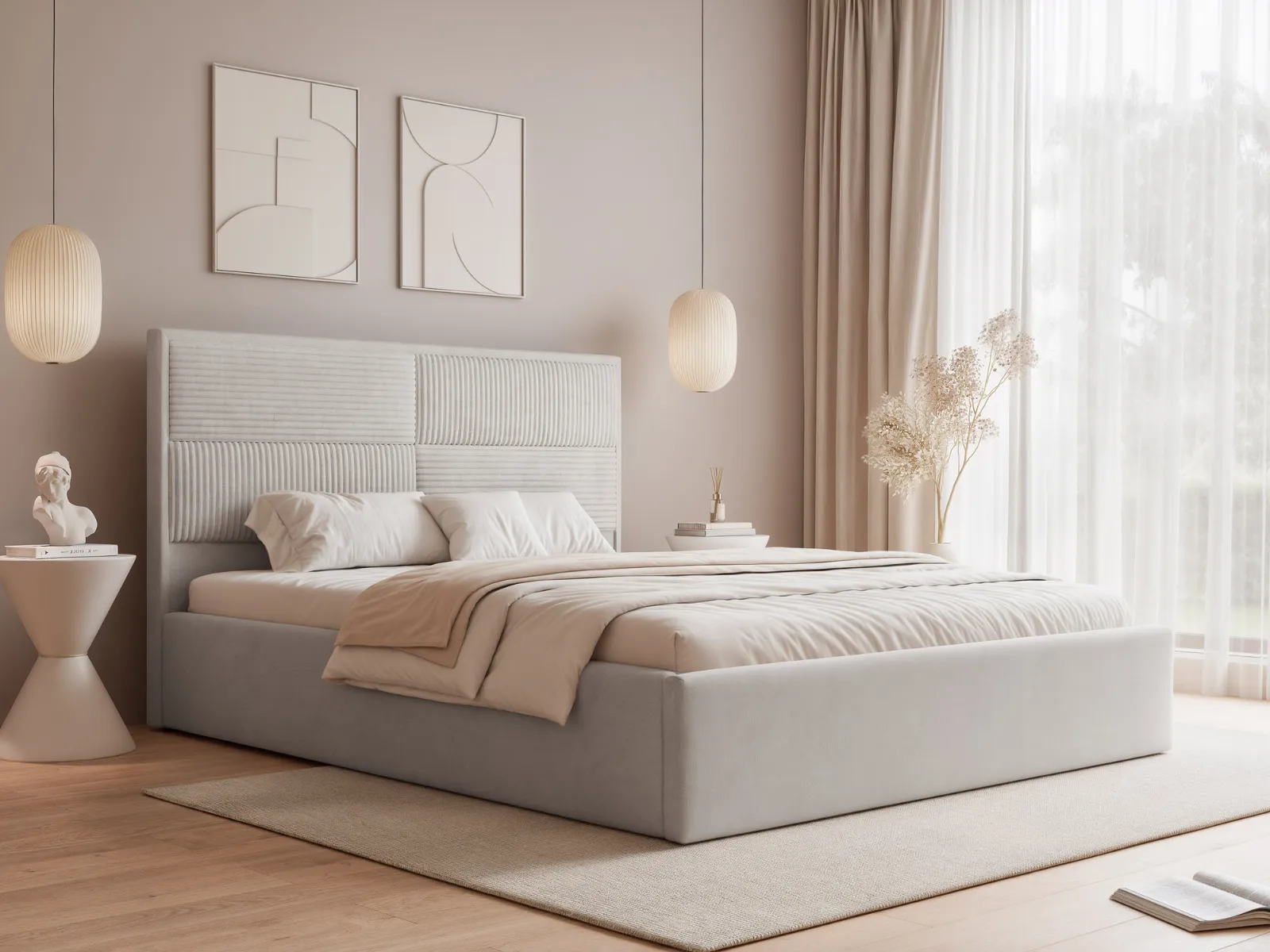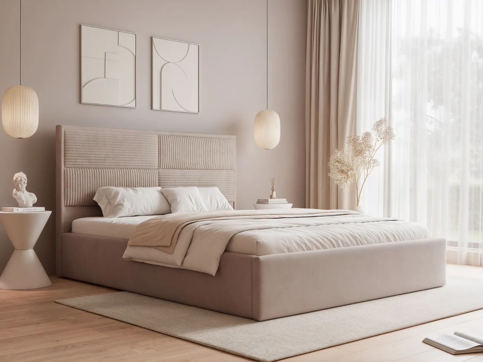 Łóżko Mia 140x200 to kwintesencja minimalistycznego designu połączonego z subtelną elegancją. Charakterystyczne pionowe przeszycia na wezgłowiu dodają mu lekkości i wyrafinowanego stylu, sprawiając, że doskonale komponuje się zarówno w nowoczesnych, jak i klasycznych sypialniach.