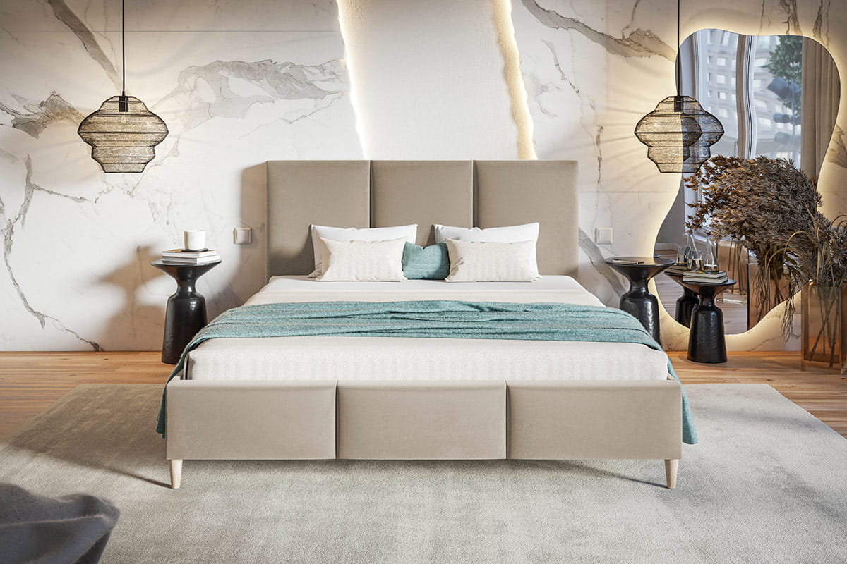 Łóżko tapicerowane Moniro w stylu skandynawskim to doskonały wybór dla tych, którzy szukają elegancji i funkcjonalności w swojej sypialni. Wykonane z beżowego weluru, łóżko Moniro emanuje subtelną elegancją, a jego prosta konstrukcja na drewnianych nogach idealnie wpisuje się w minimalistyczne i nowoczesne aranżacje. Stylowe przeszycia na zagłówku i ramie dodają łóżku wyrafinowanego charakteru, dzięki czemu stanowi ono doskonałe uzupełnienie stylu skandynawskiego.