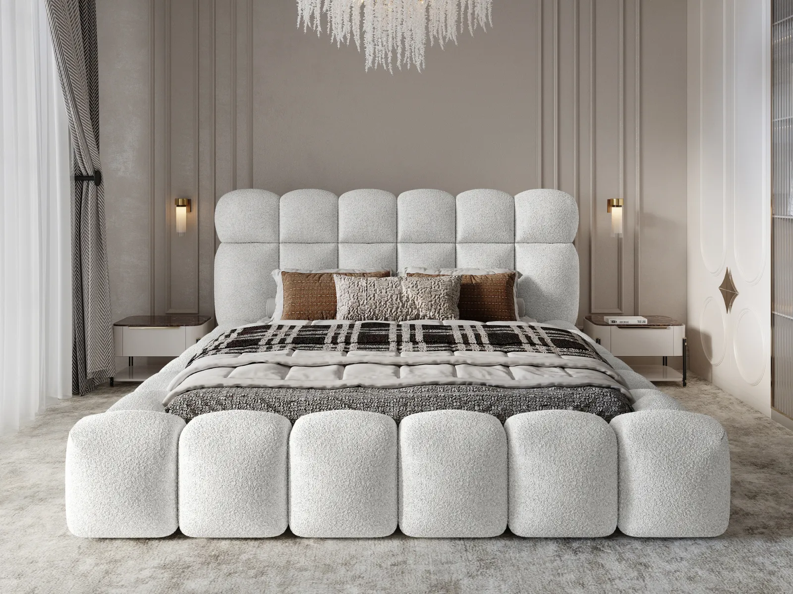 Wykonane w modnej tkaninie bouclé Quelle, łóżko wprowadza do sypialni ciepło, teksturę i styl, który nigdy nie wychodzi z mody.